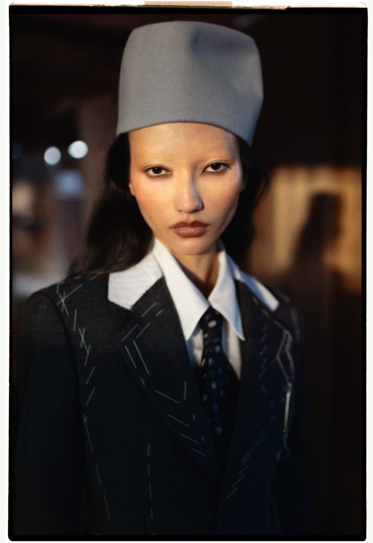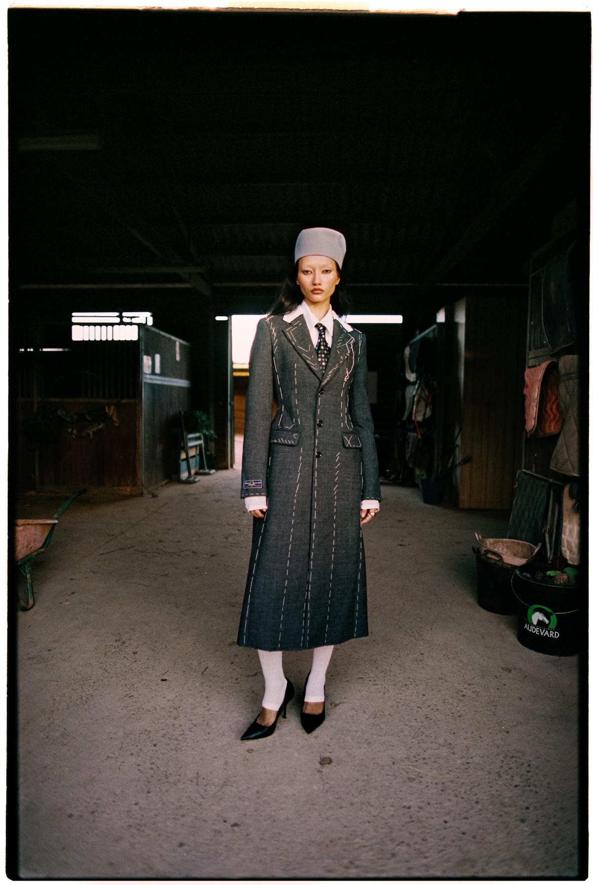 Hat Otti Hats, Coat Moschino, Shirt Equipment, Tie Loewe