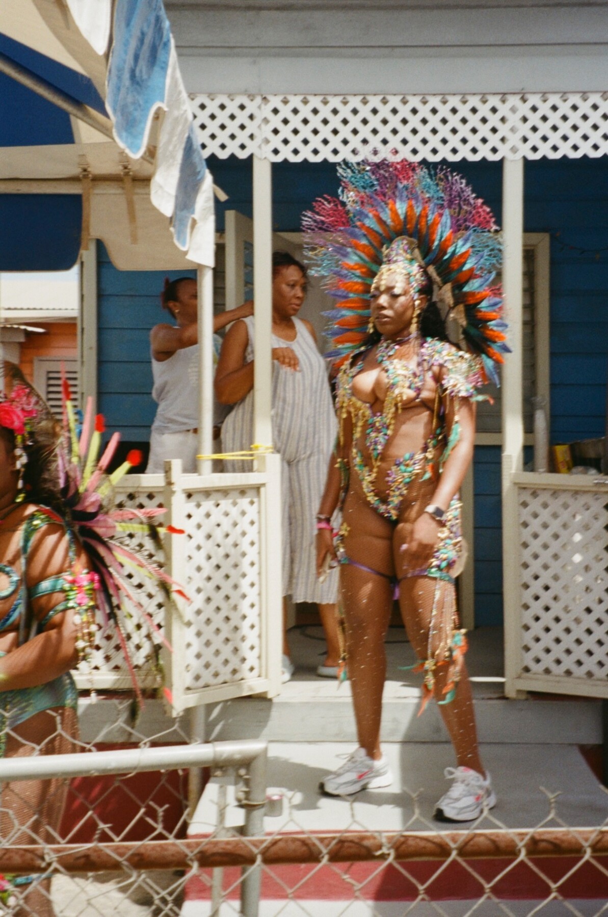 For hours, we trailed behind a fleet of mega trucks kitted out with sophisticated speaker systems that propelled sound waves between houses, bodies, and feathers. The masses, led blindly by melodic soca rhythms, strategically navigated their way through the twists and turns of narrow Bajan streets, on what is—for most—the sweetest day of the year.
