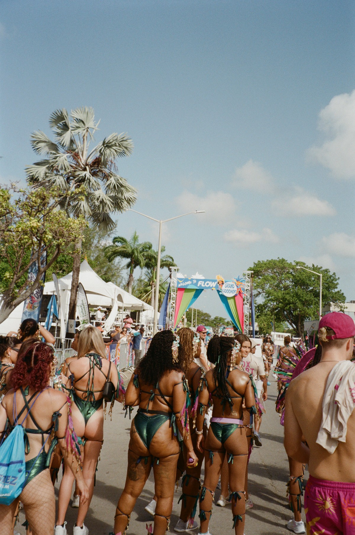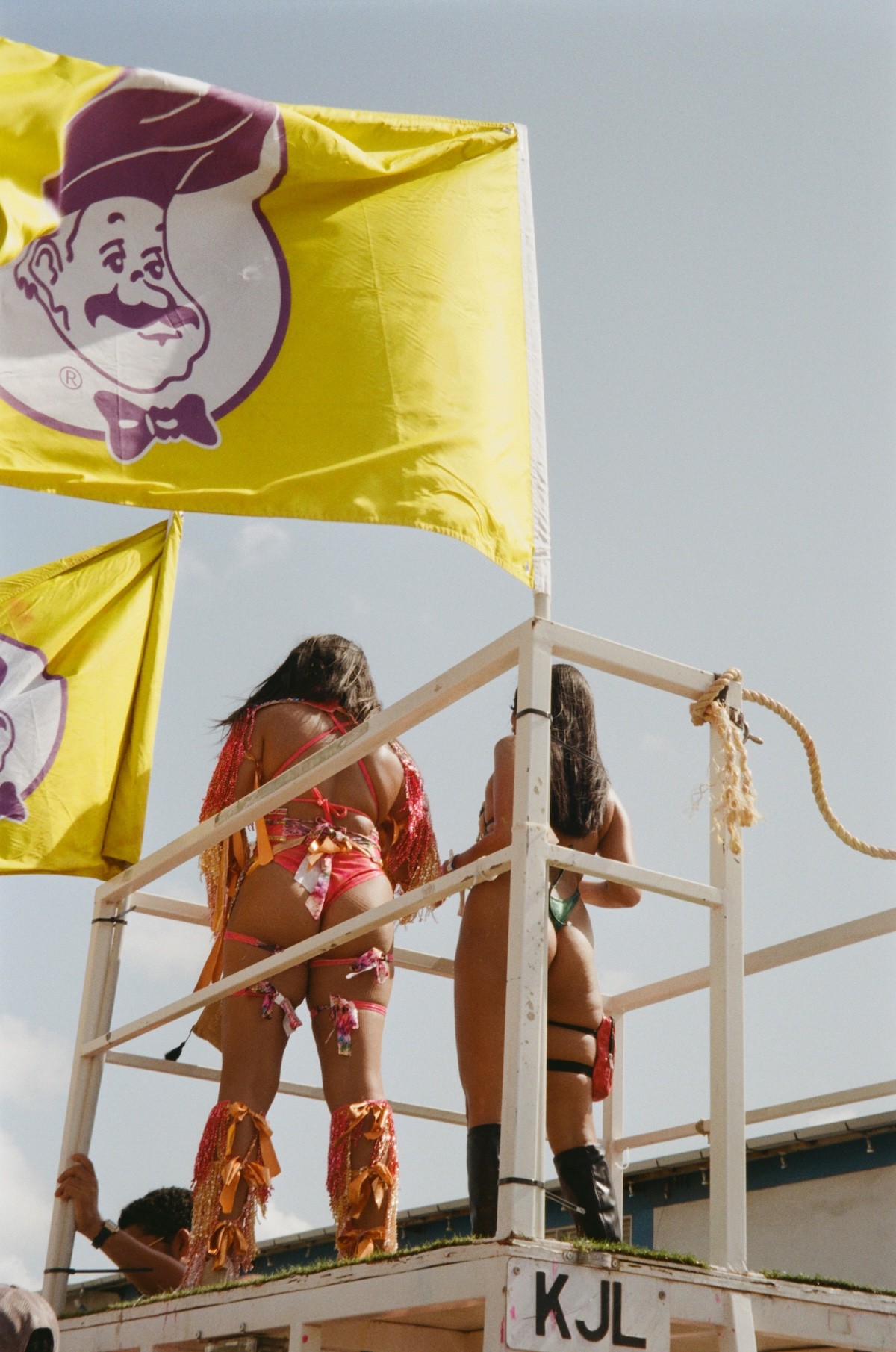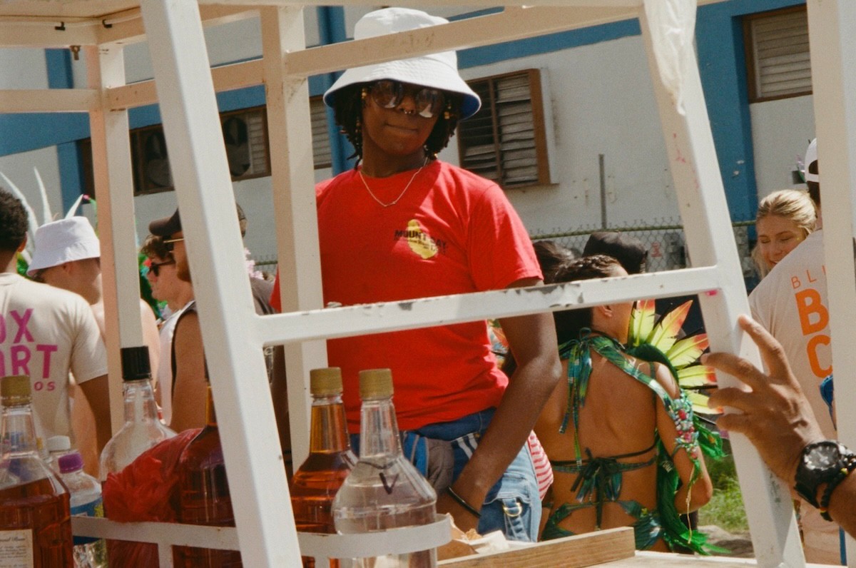 Handheld umbrellas are opened wide, the surface area of their brims shielding the rays, not rain. Those unable to escape the relentless force of the sun experienced its wrath in full force as it belted down aggressively on every inch of skin exposed, leaving evidence of the fishnet tights and bikinis that came before in the form of unfavorable tan lines. Some clawed onto Chefette—Barbados’ beloved homegrown fast-food chain—branded mini-electric fans that even on full blast barely provided a sliver of relief, and others retreated to garden hoses, pouring out lukewarm water along the way.