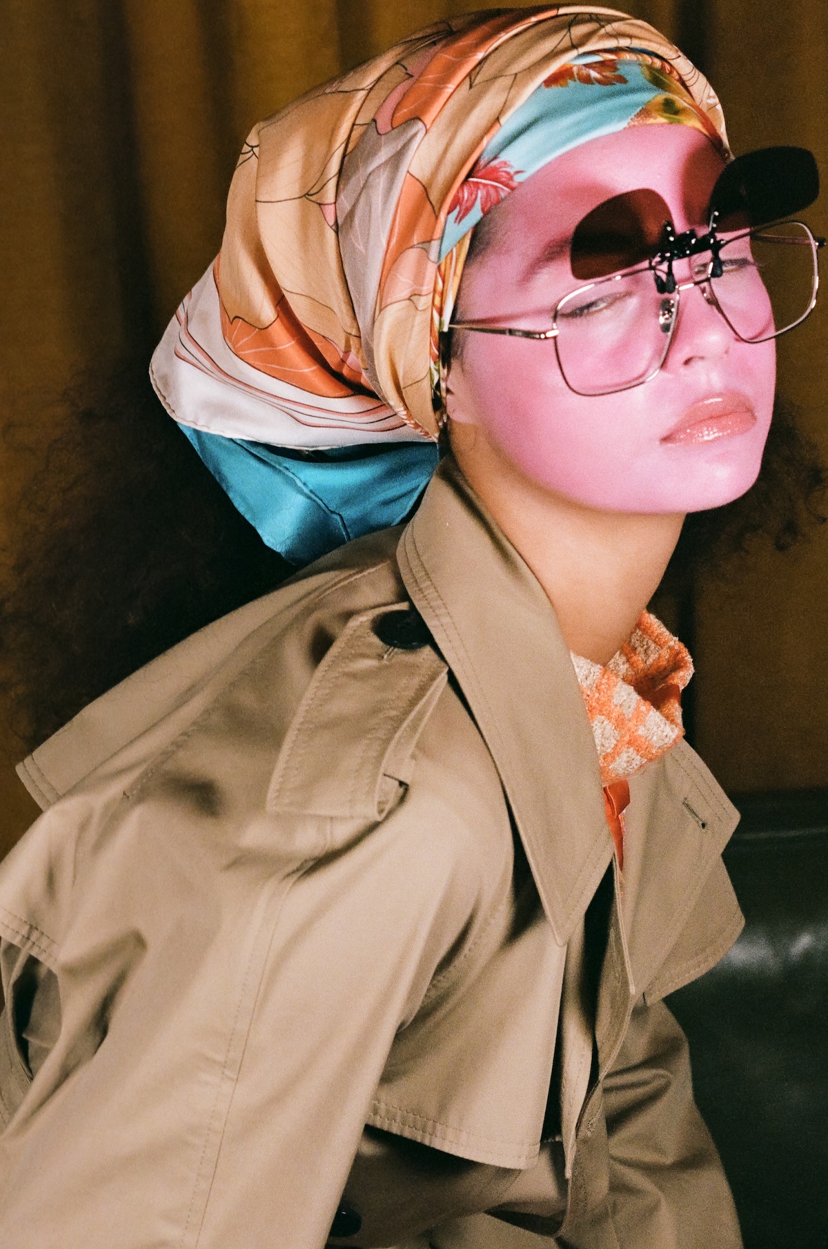Coat Christian Dior, Dress Stefania Morland, Scarf Hermès, Sunglasses Chimi