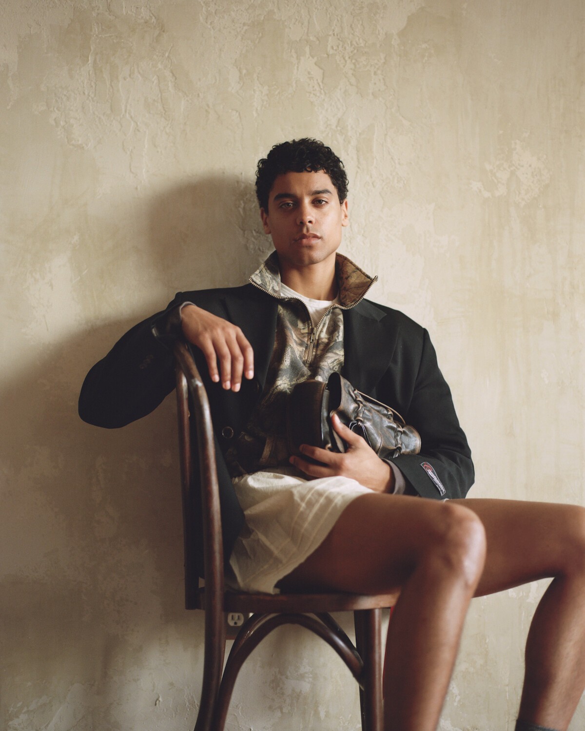Blazer Commission, Sweatshirt Stylist’s Archive, Bag Acne Studios, Boxer Shorts Off-White