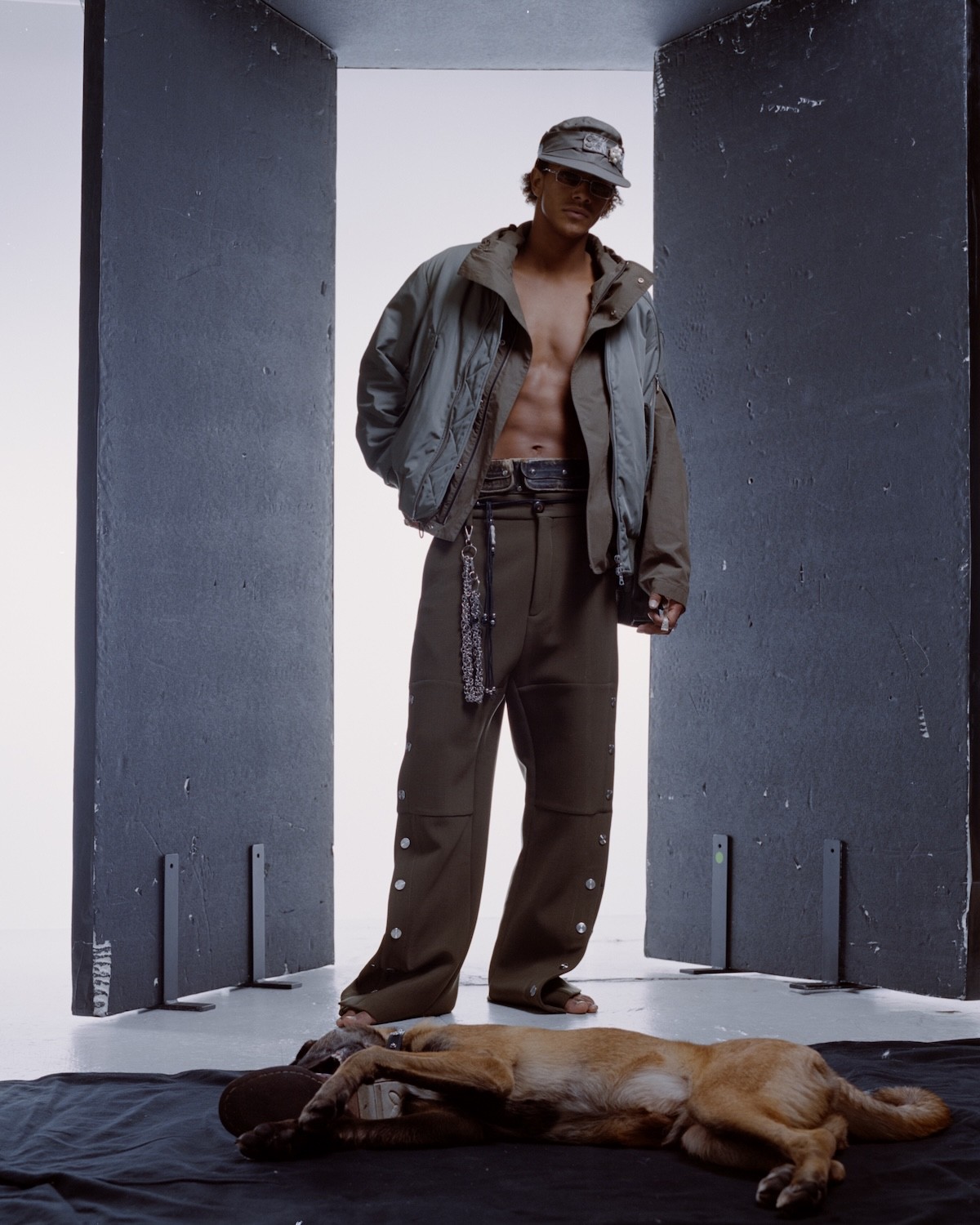 Hat FeliceOrt, Jacket Jil Sander, Bomber Dries van Noten, Eyewear Kuboraum, Belt Vintage, Key-Chain Raf Simons, Trousers Namacheko