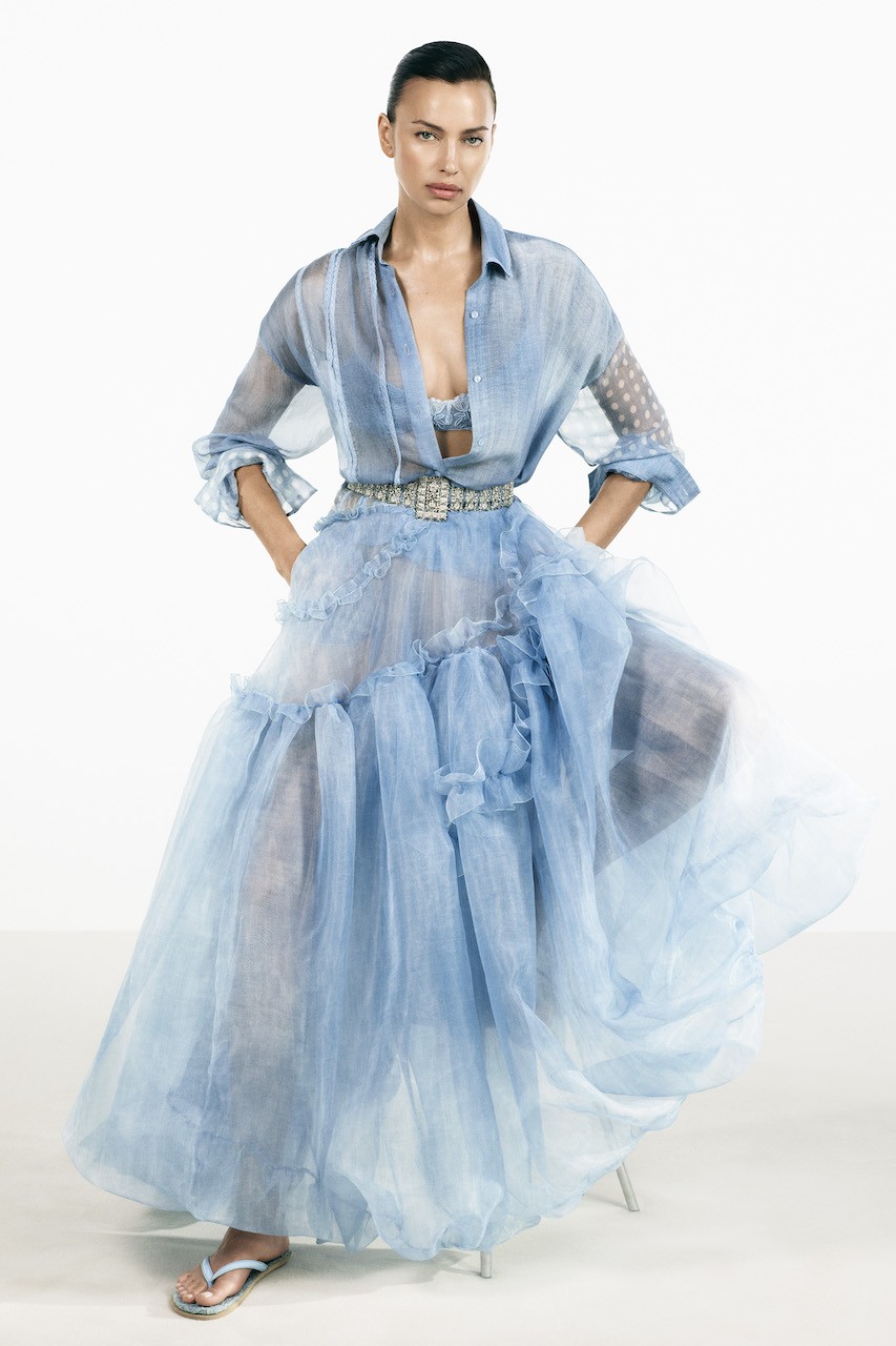 The campaign is fronted by Irina Shayk, whose direct gaze and controlled gestures frame a femininity that’s as much attitude as anatomy. In color, that language reads light—sheer blues, whimsical layers, and translucency that lets structure show through. In black-and-white, the mood snaps into a disciplined ease: masculine codes worn cleanly, from precise tailoring to a suit-and-tie proposition, and a men’s pajama treated with rigor but kept fluid.