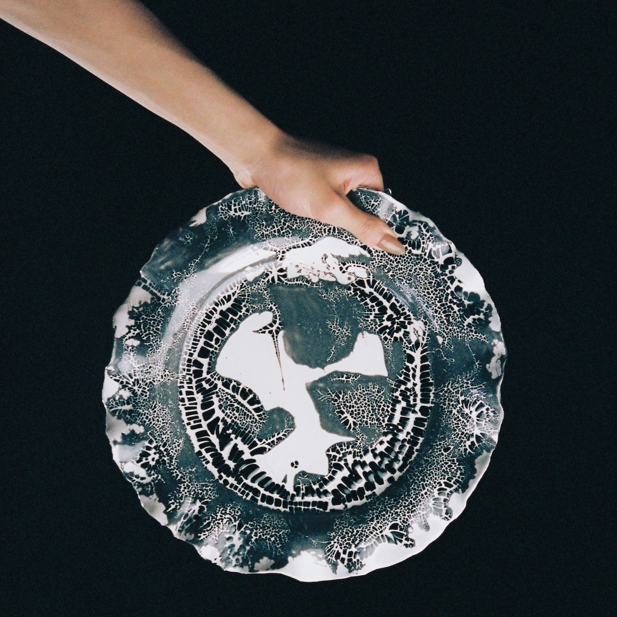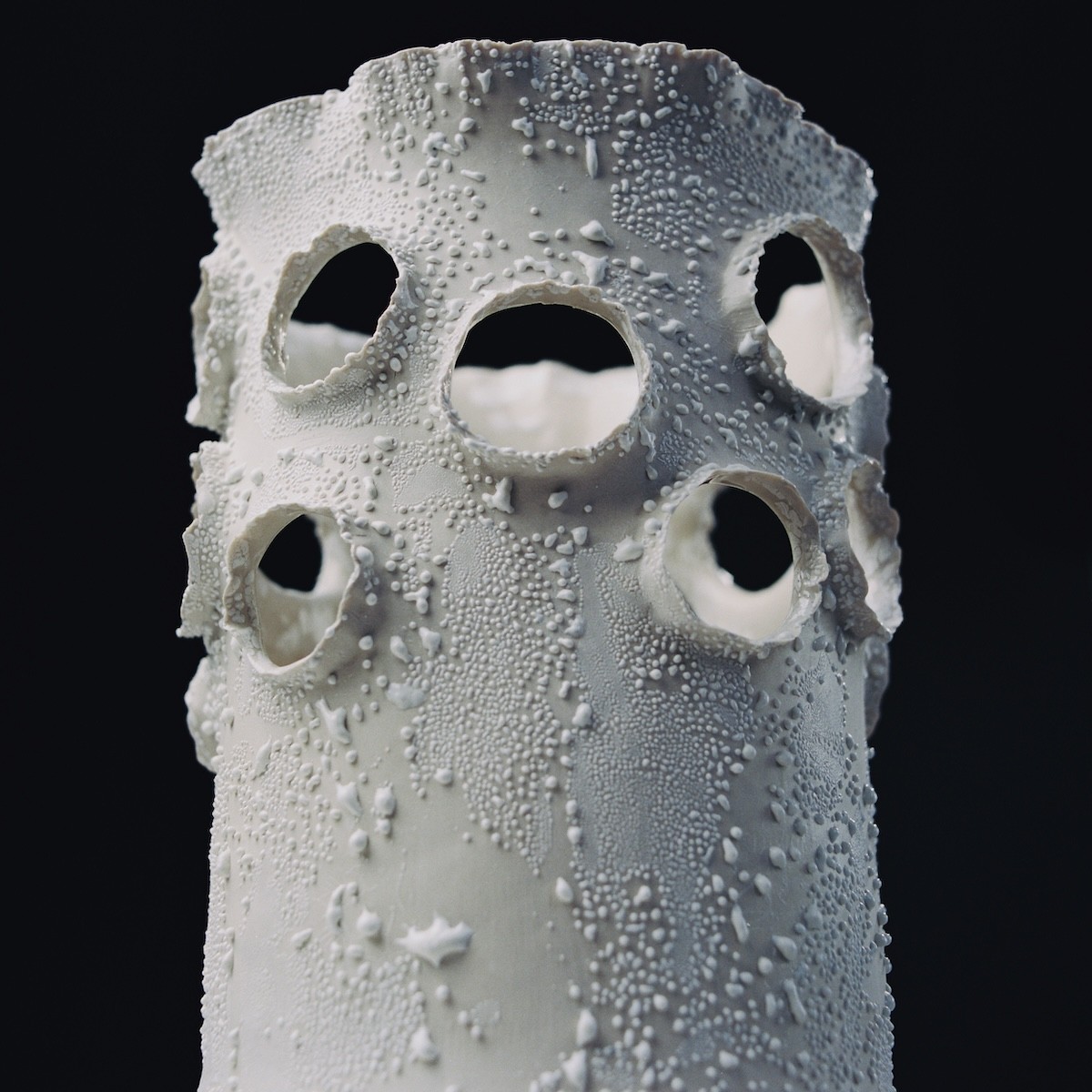 She glazes and paints each piece by hand to the rhythm of experimentation, play, and serious patience. Once shaped by the kiln, her work carries patterns and textures that seem to echo an imprint of a memory, not unlike how fractals tell the story of a quiet precision unfolding behind chaotic equations. Nathalee is no stranger to this chaos, as the unpredictability of her materials is foundational to her practice. With a background in photography and painting, Nathalee is a natural storyteller. Her porcelain objects are steeped in the undercurrent of the Pacific West Coast, where the dendriform shapes of coral and barnacles cling to coastal rocks, and fungi wrap tree trunks like ribbons in old-growth forests. This connection to the natural world has evolved into a narrative cornerstone in her work over time, emerging from a cyclical process. Her ceramics seem to emerge from nature, sparking in turn further organic exploration, creating infinite, self-similar worlds within worlds.
