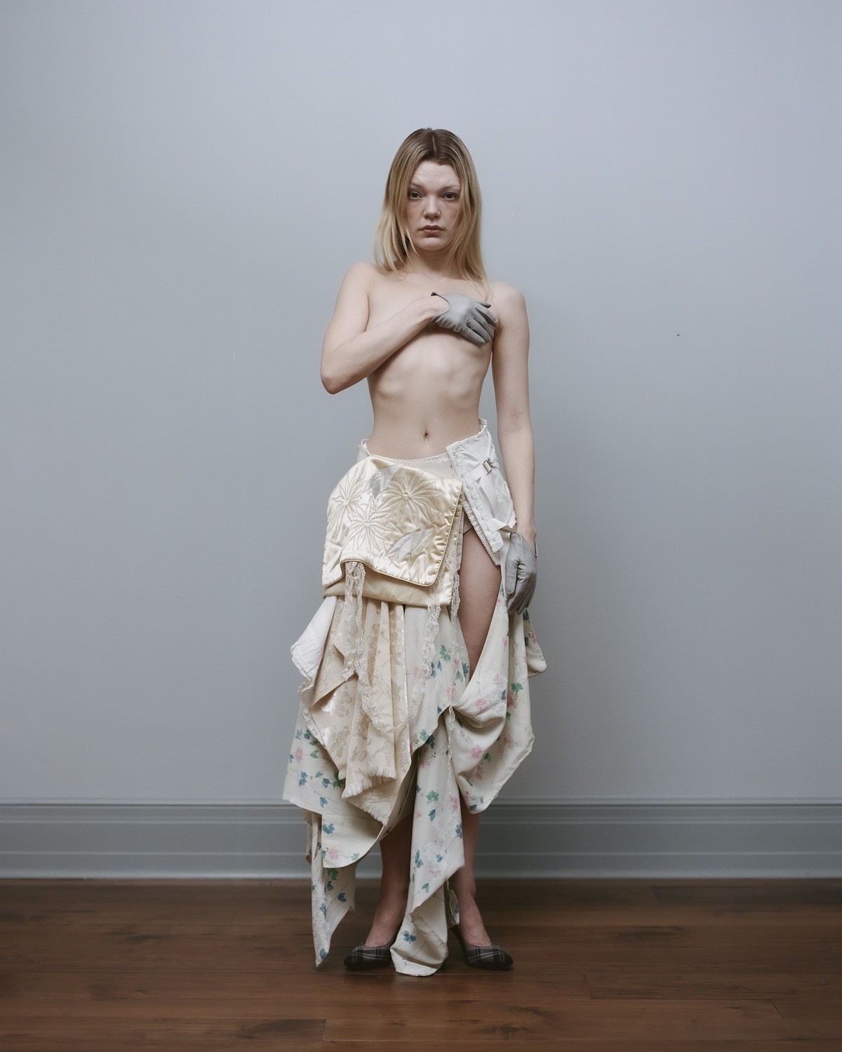 “I like to come up with characters who might wear what I’m working on,” she says, a process that allows her to more fully realize the universe around her clothes. Her work often centers on figures suspended between girlhood and womanhood, drawn to that sense of in-between.