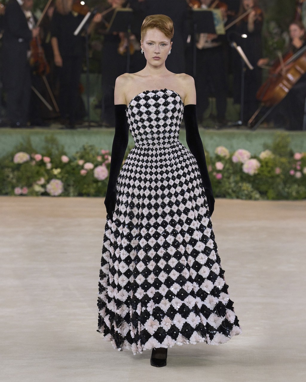 Inspired by the opera, opener Naomi Campbell set the tone for a night of drama. A live orchestra underscored gowns that entwined fantasy with courtly dress: velvet cut tight to the body, skirts swelling into sculptural arcs, capes that trailed like twilight across the floor. Everywhere, rosettes bloomed–at throats, on gloves, stitched into bows–adding whimsical interruptions to the grandiose designs. Quinn’s silhouettes leaned monumental, but that was the point; an embodiment of what would happen if couture dreamed out loud.