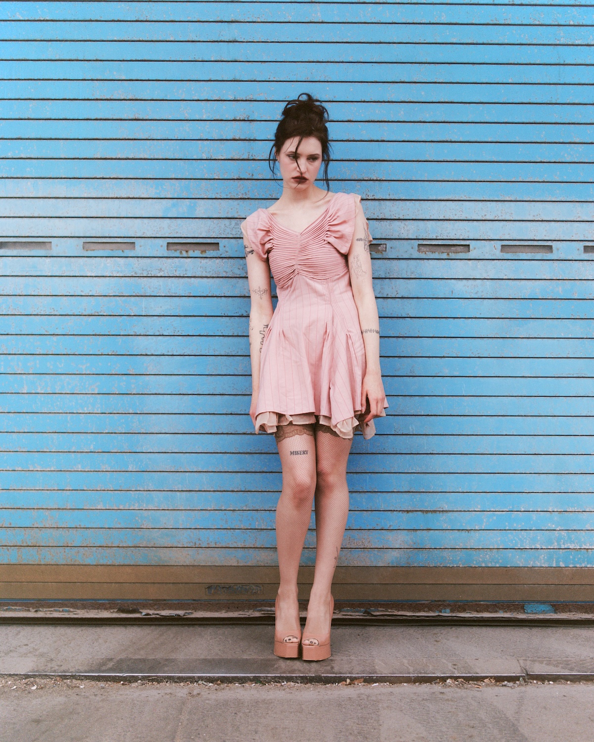 It’s also the first time Masterson has incorporated menswear, a concept that has been at the back of her mind since she started her label. Her interpretation, however, moves beyond black and white and lands in androgyny. “Gender is being dismantled,” she says, “and how it’s shown in collections doesn’t have to be a binary at all.” The asymmetrical, pinstripe, fencing-esque suit jacket and matching low-waisted, wide-leg pleated trousers were photographed on both male and female models, reinforcing the push and pull between fluidity and rigidity.