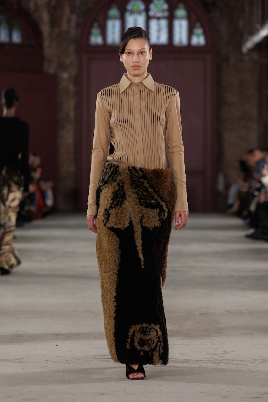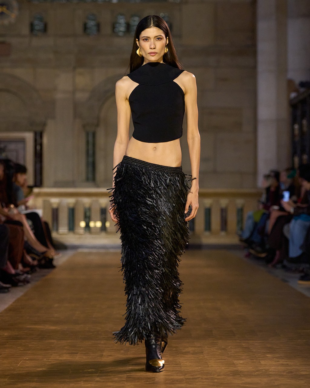 At her own label, Scott explored sensuality and lineage with even greater freedom. Drawing from the work of Afro-Cuban artist Wifredo Lam and his horse-human hybrid figures—the femme cheval—the collection unfolds, placing the form at the core. Sheer layers and split knits reveal skin with intention, while equestrian-inflected tailoring exaggerates the hip and elongates the torso into statuesque columns. Fringe and linear detailing nod to mane and whip from a more conceptual standpoint, as pressed mohair with razor-sharp lapels mimics the density of fur. Here, Scott roams freely in her imagination, elevating heritage while allowing fashion to speak with clarity.
