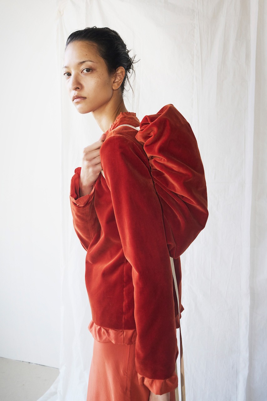 Each season, the rising designer deepens her command of complex form and gothic romanticism. Signature bustles return, reworked through wrapping gestures that shift shape as the body moves. Dense terry and metallic-like velvet lend weight and tactility, while pieced textiles and torn lace invoke a haunted edge that is becoming an ever-stronger signature. Still, color finds its place: saturated persimmon and soft iris punctuate the beautifully somber blacks. New this season is the Bustle bag—a slouchy, sculptural companion that mirrors her liquid draping.