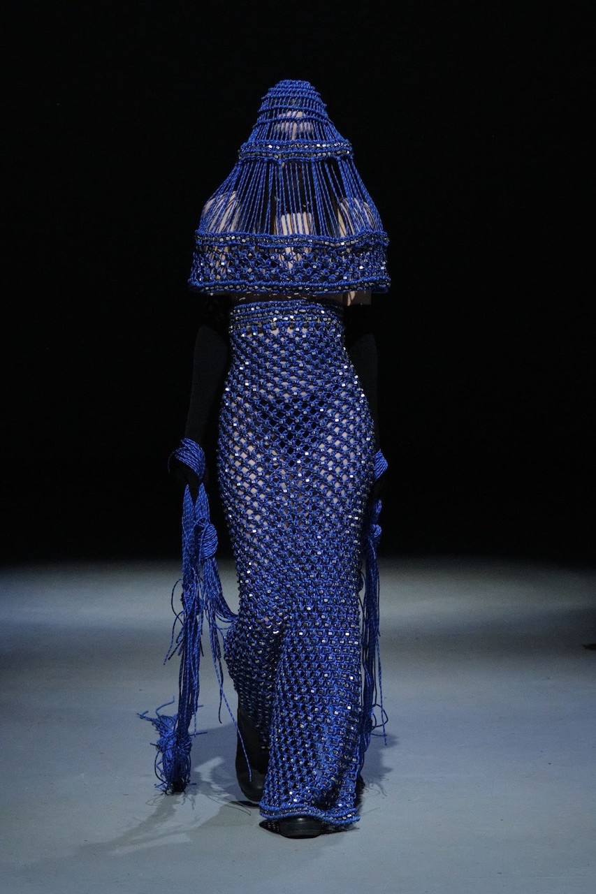“The Summit” might be the Brooklyn designer’s most monumental collection yet, taking her office-uniform codes into utility and expedition wear and pushing them to elevated heights. Modular construction drives the collection, with convertible silhouettes and zip-off boot elements created through her Sorel collaboration. Performance details anchor the styling, yet form and function are continually subverted. A standout blue gown, crocheted entirely from paracord and paired with a sculptural headpiece, shifts her language from its utilitarian roots to something almost celestial. These juxtapositions create a tension between corporate structure—the internal drive to be useful—and the resulting desire to break free.