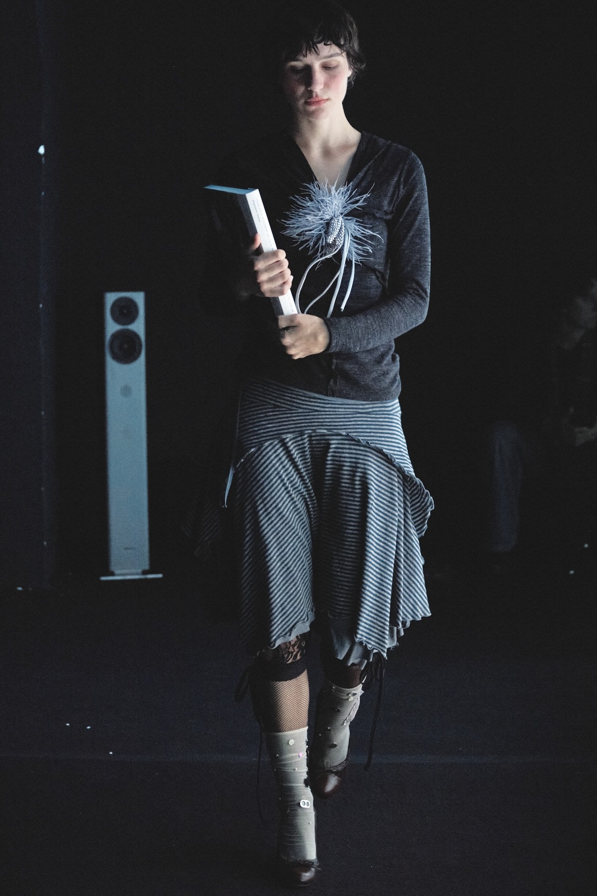 The collection carried a moody tone throughout, grounded in muted hues of deep grays and blues. Each look felt considered, maintaining a sense of ease that translates into everyday wear. NIMPH’s asymmetric skirts cinched with lace, reimagined shirt dresses, raw hems, and off-centered necklines created relaxed silhouettes with fabrics loosely draping and moving with the body rather than restricting it. There was a clear focus on harmony with each piece fitting together like a puzzle. The garments felt personal to the model, as if lived in and naturally molded to their everyday life.