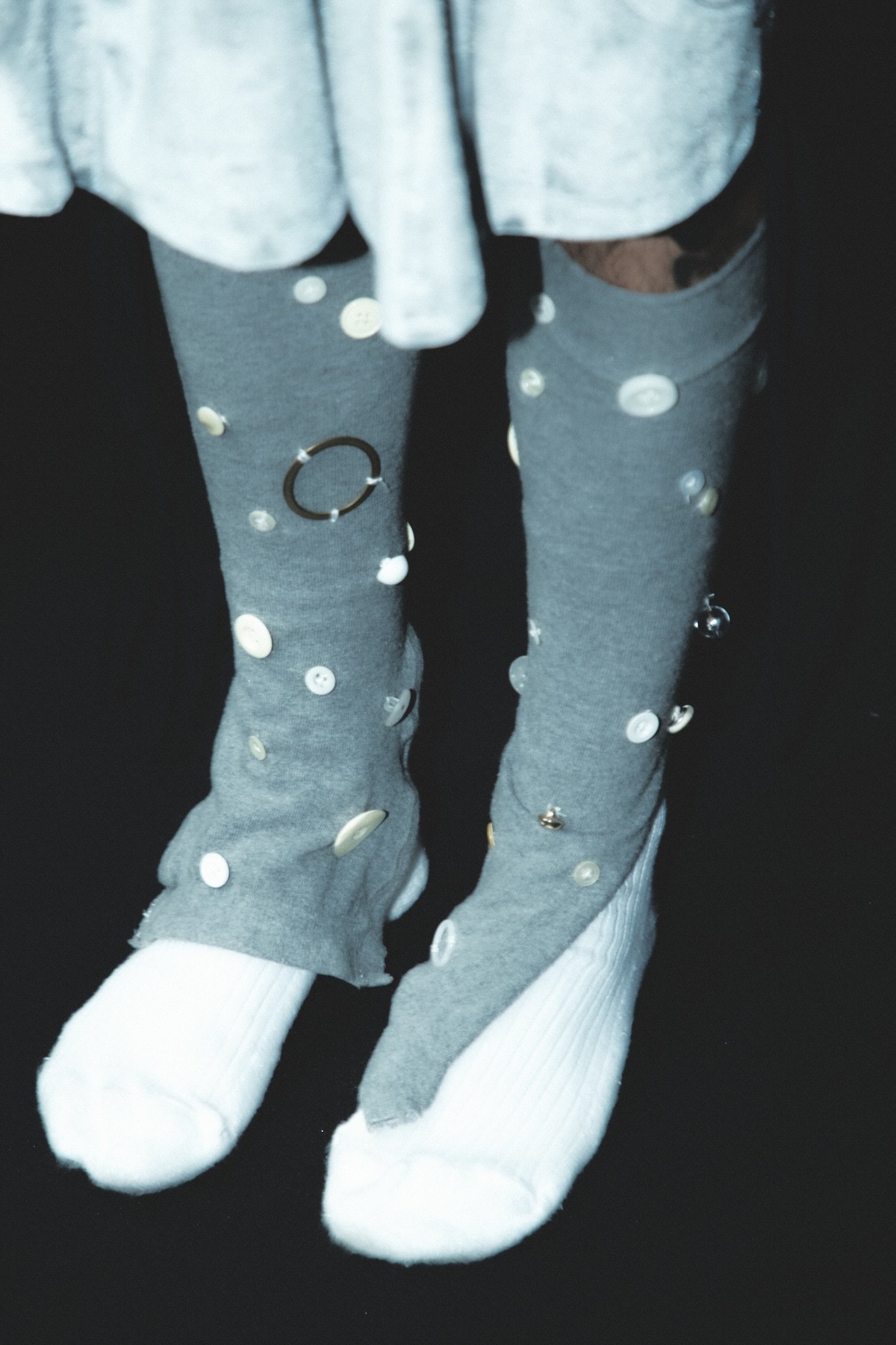 Accessories added a more playful dimension with everyday objects reworked into embellishments. Think can rings, buttons, stones, and small gems sewn onto delicate socks, hems, and sleeve cuffs. These details felt personal, almost like collected mementos from lived experiences — an ode to wearing your memories, giving each piece a sense of individuality.