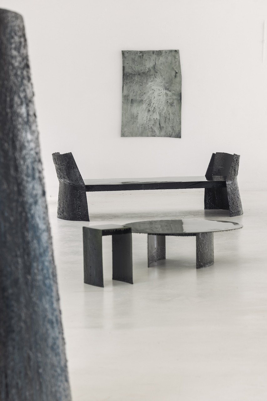 The furniture throughout is ergonomic and entirely original. It defies the conventions of ready-to-assemble design, existing instead as small series, limited editions, or fully custom commissions. Even familiar materials become extraordinary through careful craftsmanship, such as the long black table by Terra Atlas (Middernacht & Alexander), whose dripping dark tones feel simultaneously grotesque, erotic, and functional.