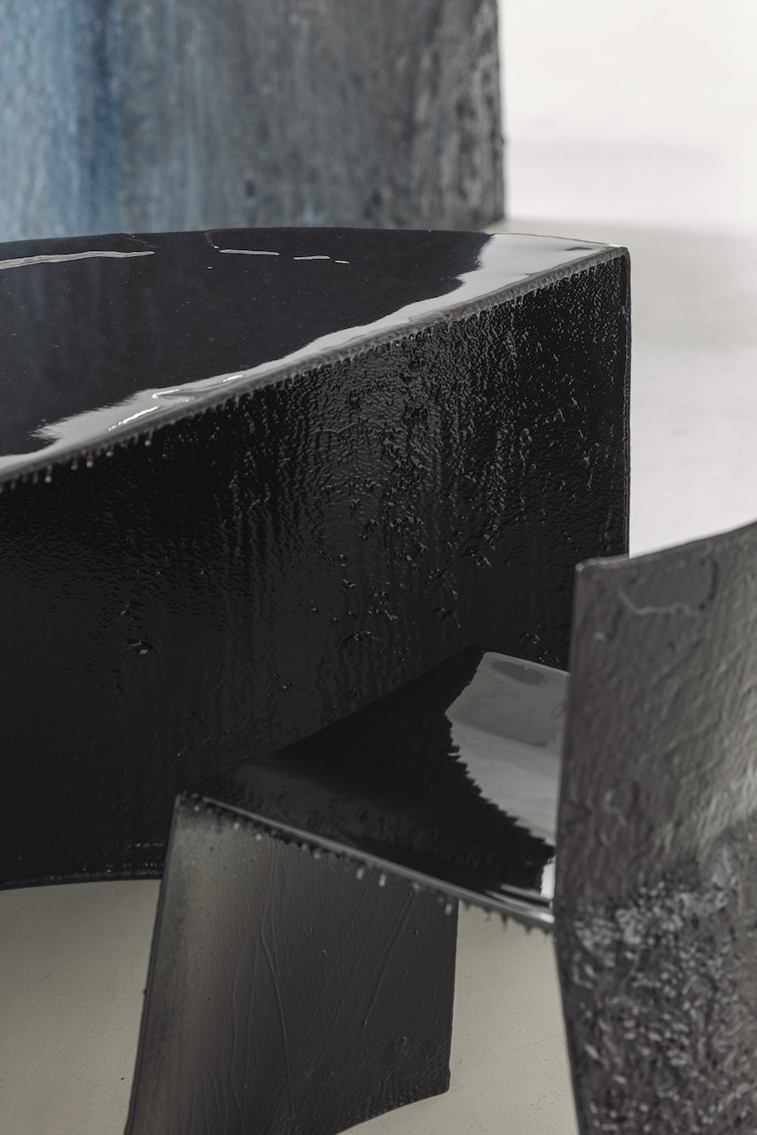 Ascending to the second floor via an elegant staircase with an old elevator at its center (a distinctly Parisian touch), the works of KRJST Studio and Lionel Jadot are displayed choreographically. Pieces are arranged to interact with one another, and a narrative emerges through their interplay. A long, glossy black table sits near a metallic sculpture, each material and form highlighting the other. “The narrative is not only about the technique. It’s about the relationship each artist has with their material,” the gallery assistant notes.