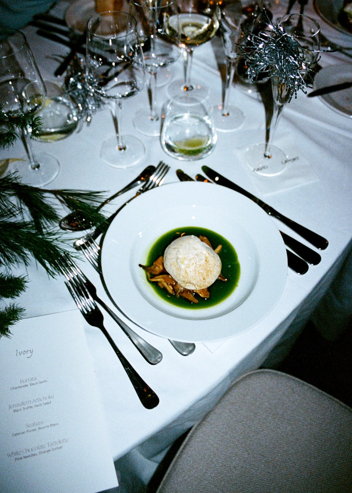 We then settled in for an intimate dinner: burrata with chanterelle and black garlic, Jerusalem artichoke with black truffle (which, I adore), Seabass with celeriac and beurre blanc, and a white chocolate tartelette with pine needles and orange sorbet. Each course had a unique wine and signature spark cocktail pairing, and the table quickly filled with conversation, laughter, and that rare sense of ease that only arrives when strangers begin to feel like friends.