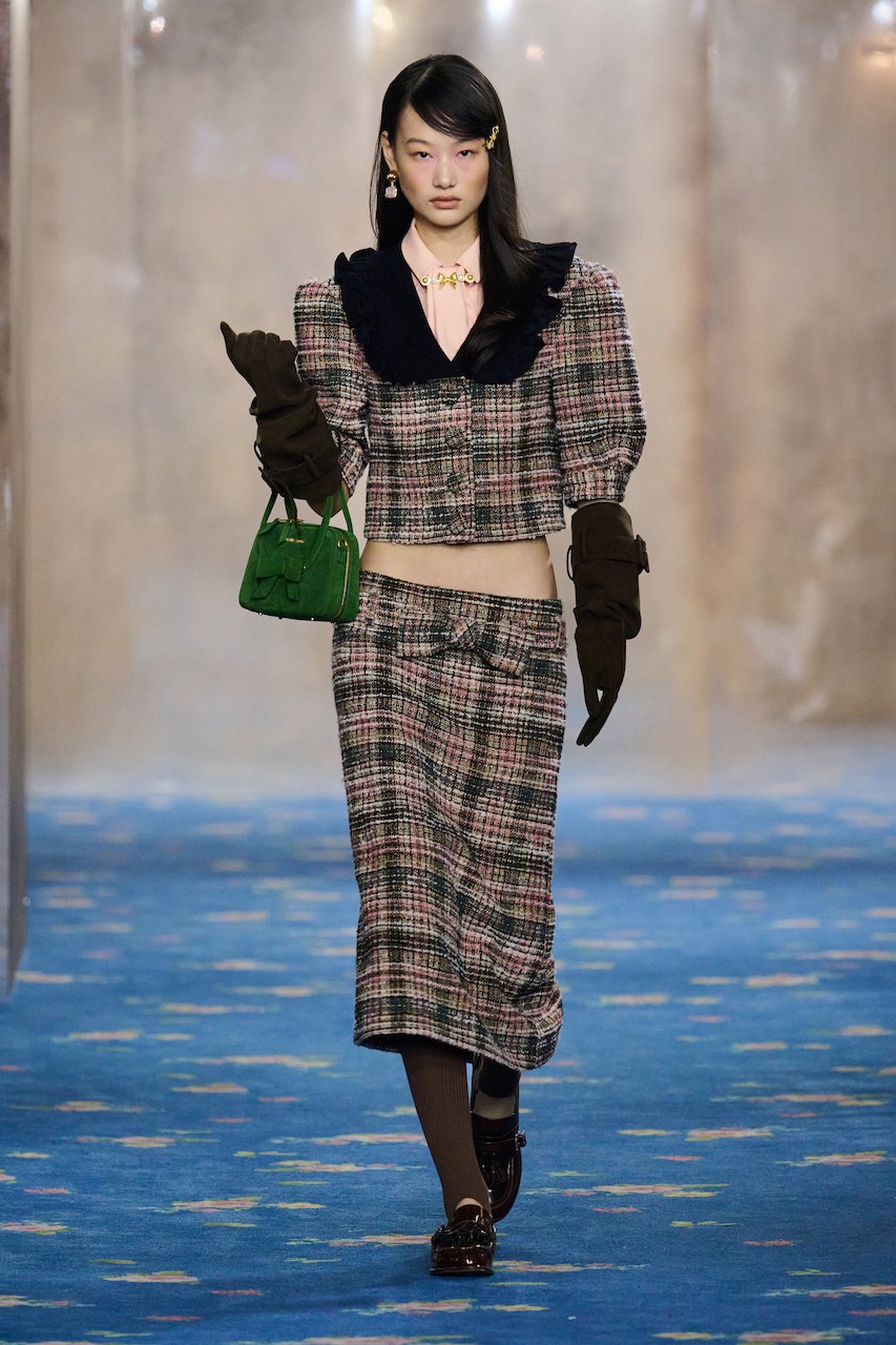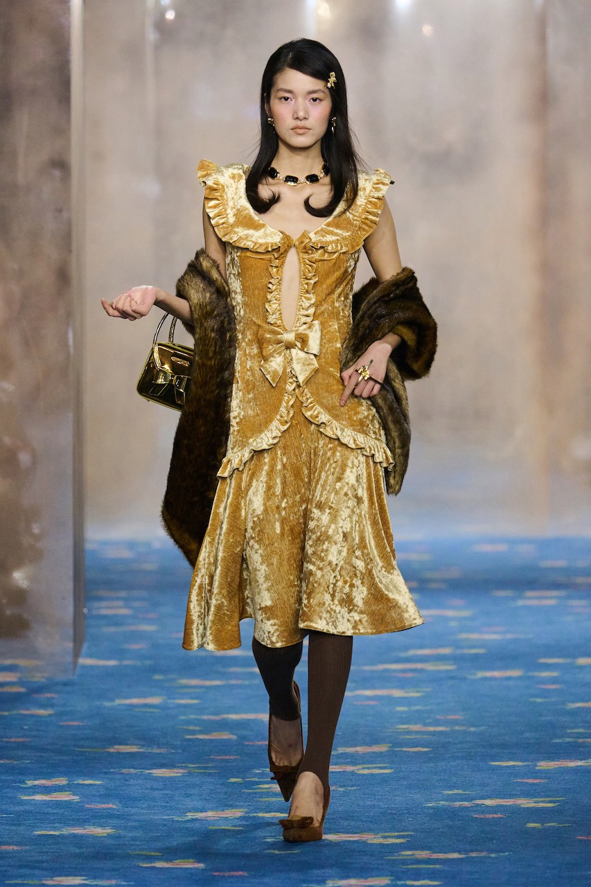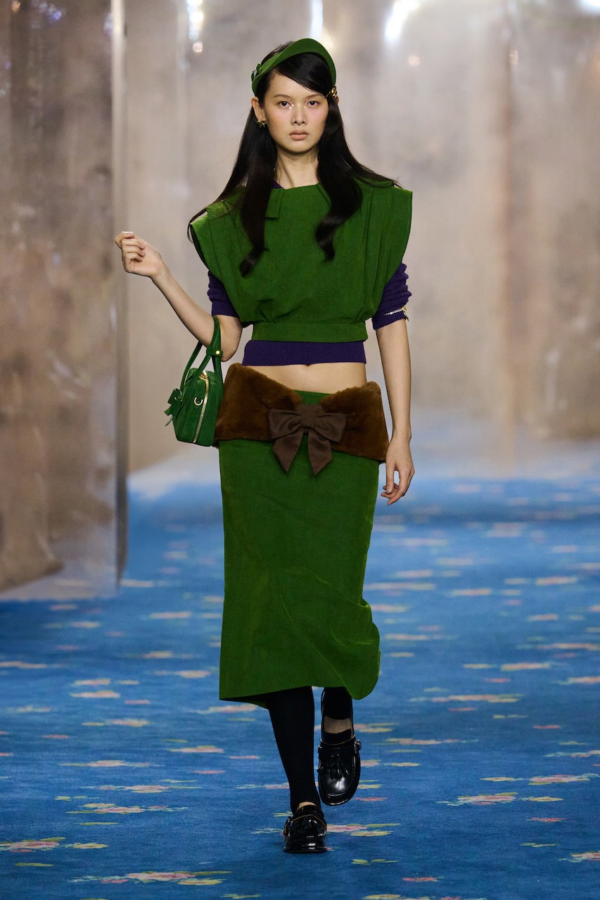 Green jacquards, gold velvet, and faux fur waist cinchers and capes evoke inherited wealth and old-world opulence, while diamond argyle knit dresses and brimmed-hat-inspired headbands imply a restrained social code. Crinkled pastels and recurring bows, however, speak to innocence, also resembling an armor that covers the brewing emotional ruptures underneath.