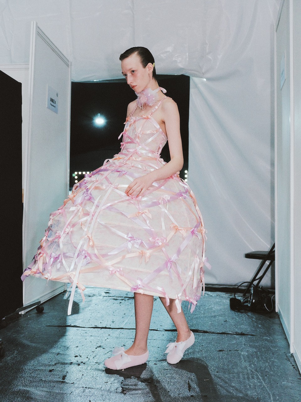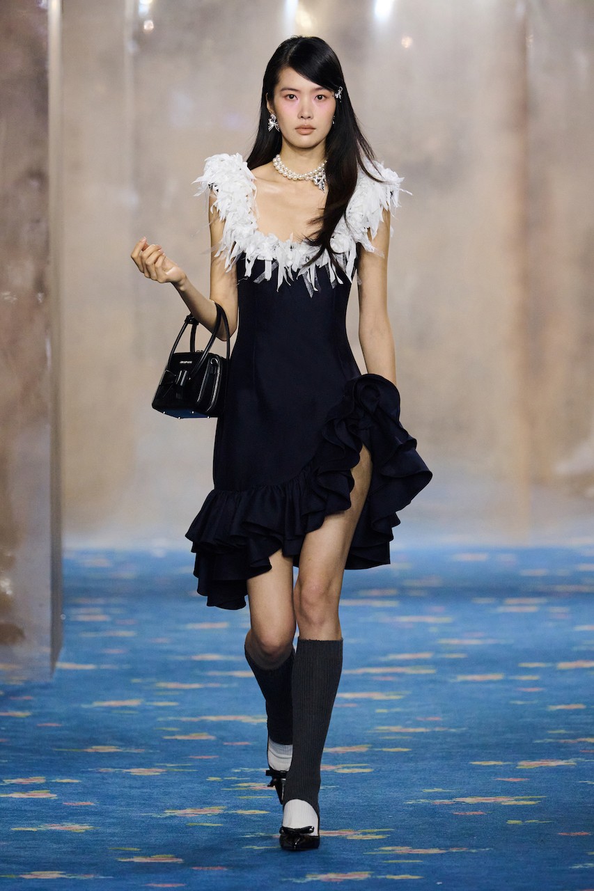 Creative Director Susan Fang’s “Air-Infinity” returned to her unmistakably dreamlike visual language with a new sense of levity. A luminous, ethereal orchestra of bows bobbed around, while ribbons trailed like streamers caught in a breeze. Clouds of white, pink, lilac, and pale blue, and ballerina silhouettes appeared throughout the collection.