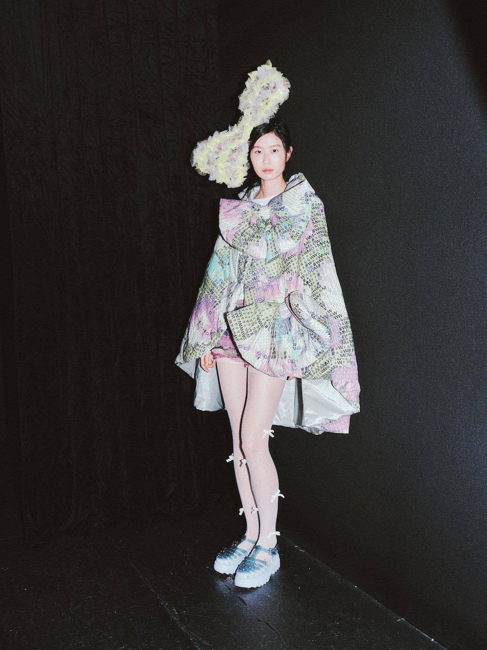 In partnership with Bambu Lab, Fang also debuted a 3D-printed shoe in multiple color ways—guests could watch pairs being printed in real time before the show began—demonstrating that even grace and reverie can be engineered and replicated. Her signature bubble beading returned, with each bead sewn individually by hand to build a crystalline, dimensional surface that catches the light like dewdrops.