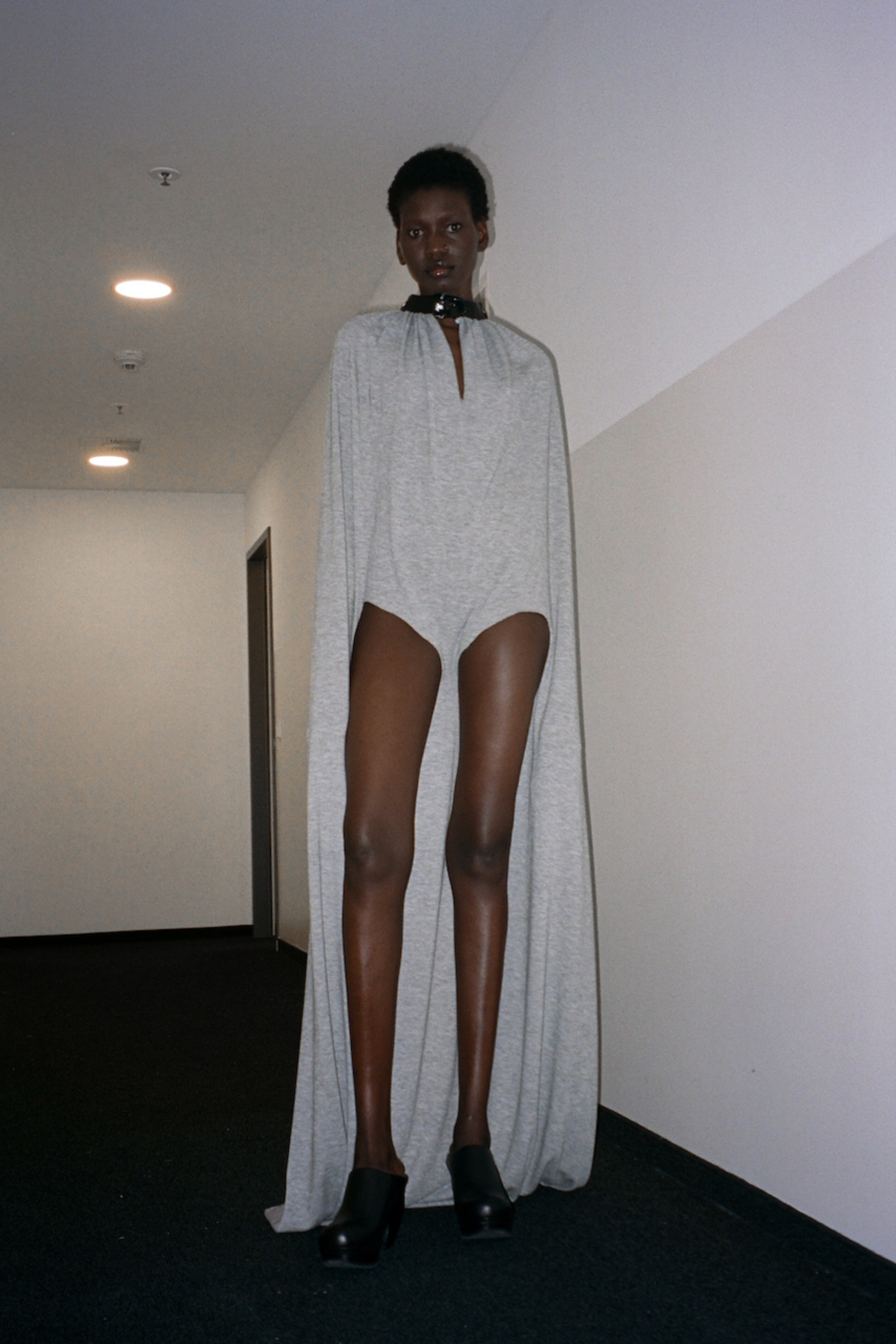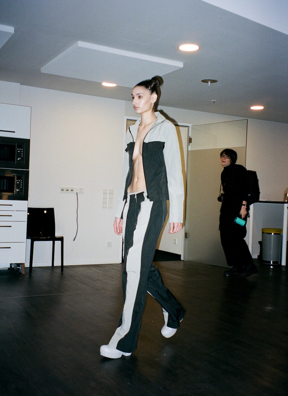 Outside the Sia Arnika show held during Berlin Fashion Week, the city outside dissolved into shadow. Inside, fluorescent light flattened the corridors of a near-empty office floor. Desks remained aligned. Screens slept. Corridors stayed exposed. Harsh white lights cut through the darkness. Everything felt paused mid-function—an in-between space, but abandoned.