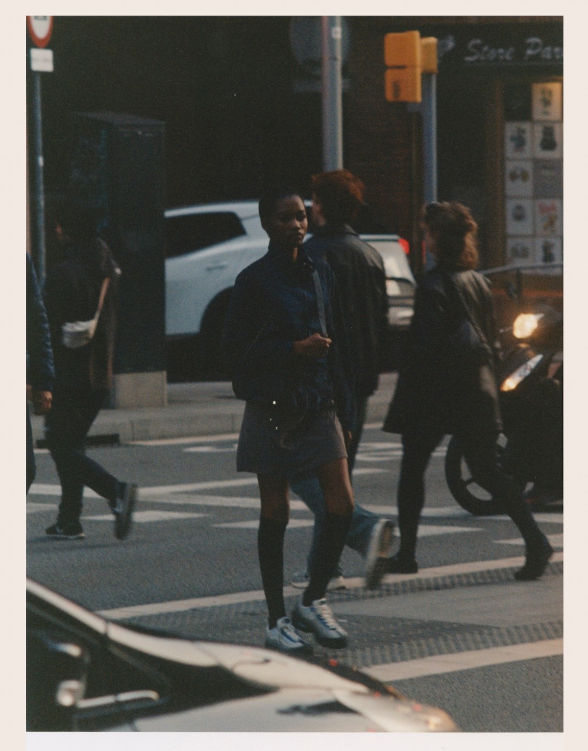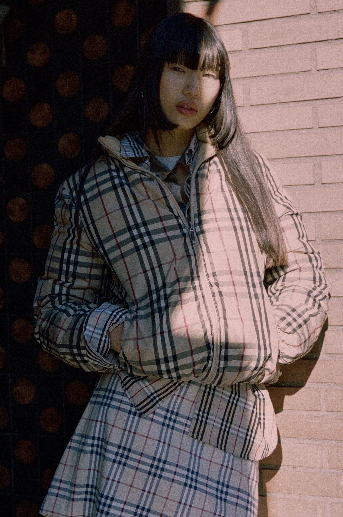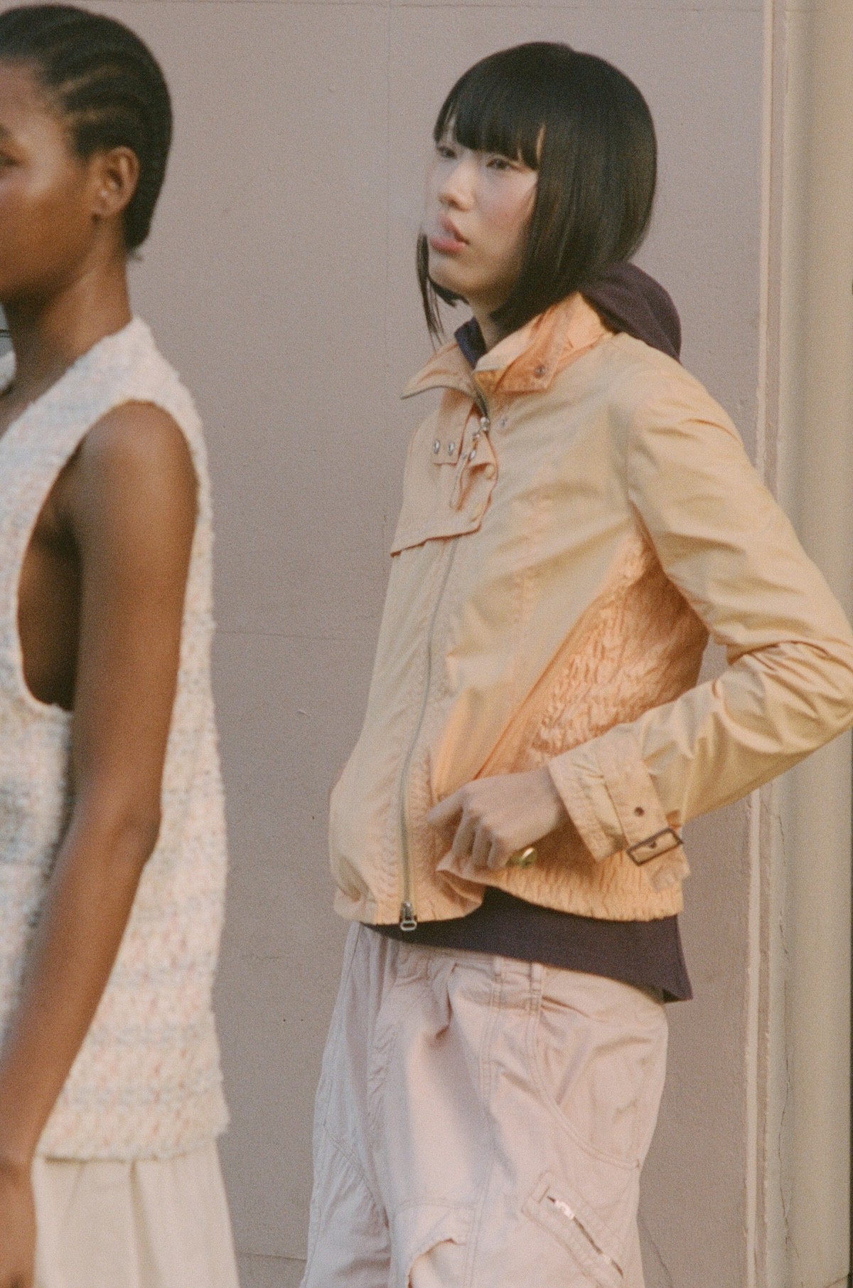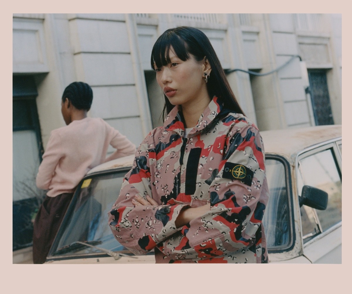 (left) Jacket Prada x Armani Jeans, Trousers Desigual, Shoes Miu Miu