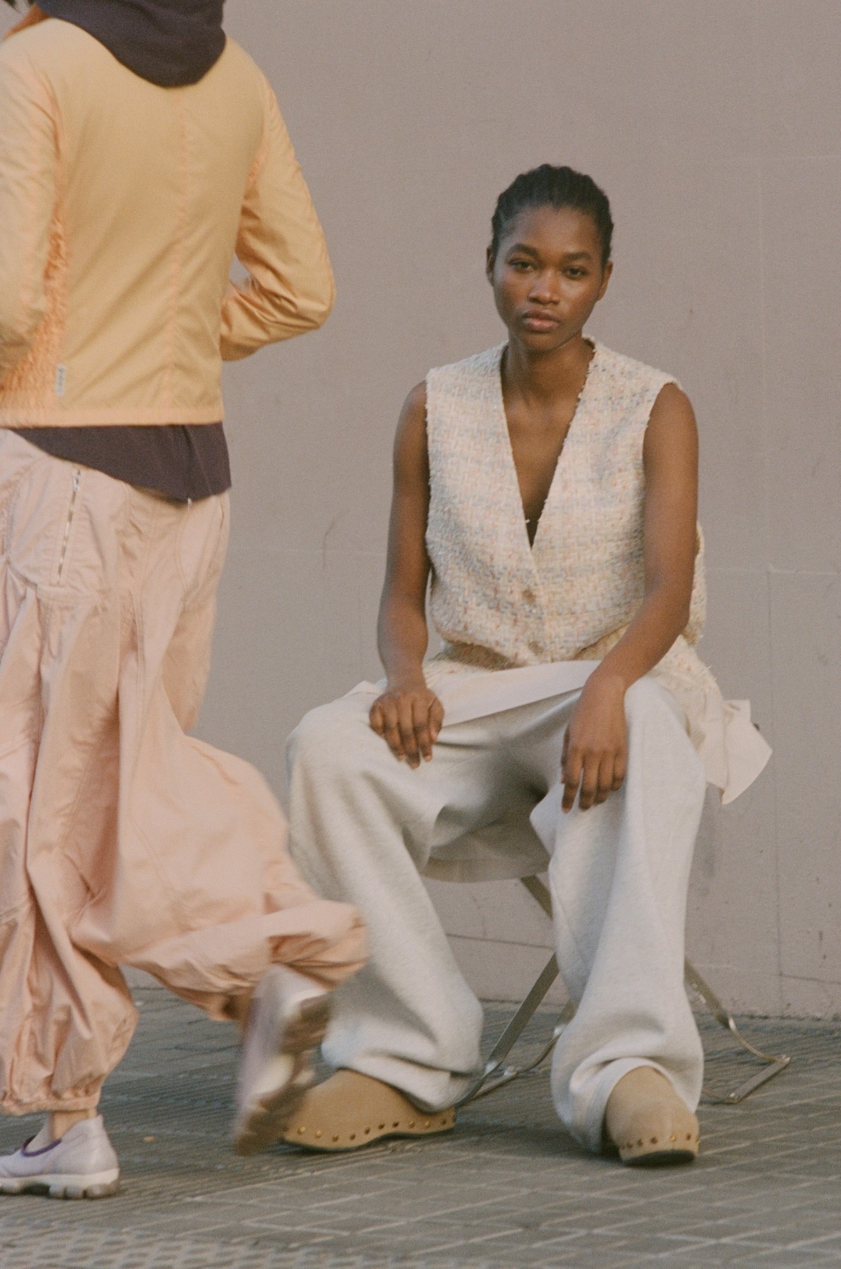 (right) Vest Chanel, Skirt Miu Miu, Trousers 99 Based, Shoes Stylist’s Archive