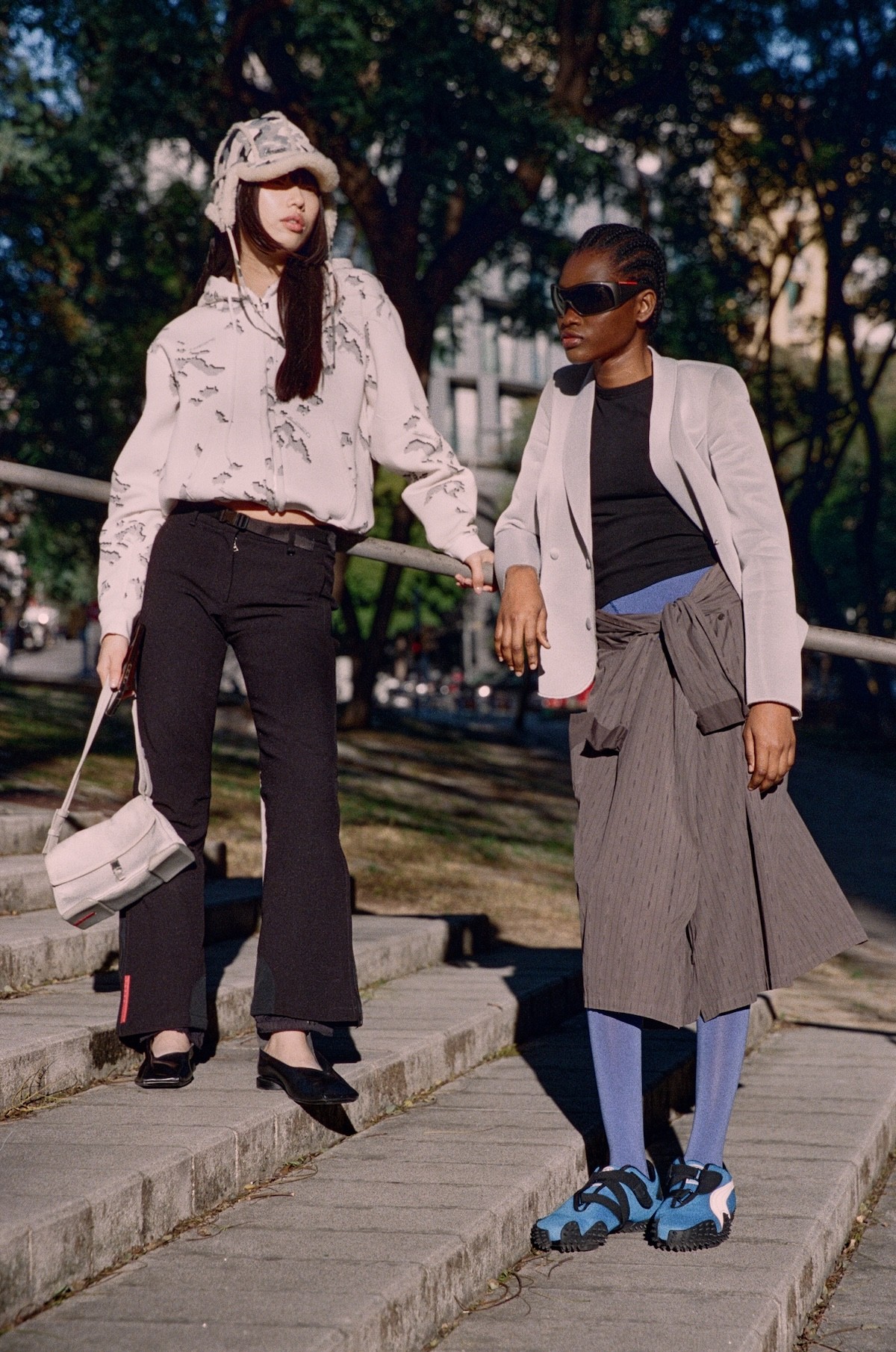 (right) Sunglasses Prada, Blazer Emporio Armani, Skirt Dries Van Noten, Shoes Puma
