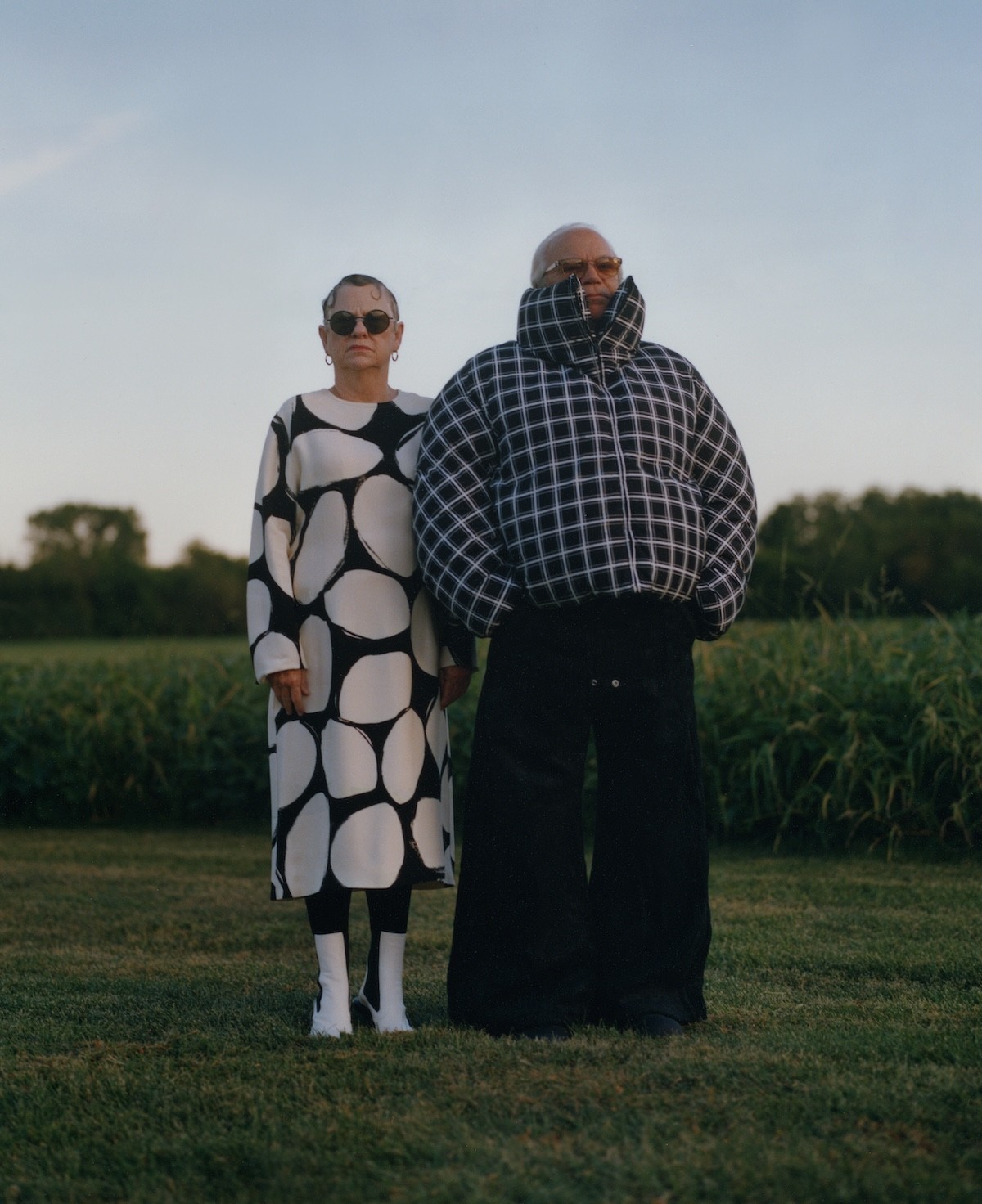 On him: Coat Marni, Trousers Rick Owens, Sunglasses John Varvatos, Shoes Burberry
