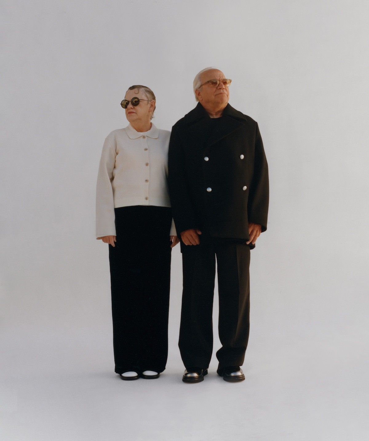 On her: Top & Trousers Jil Sander, Shoes JW Anderson, Sunglasses Matsuda