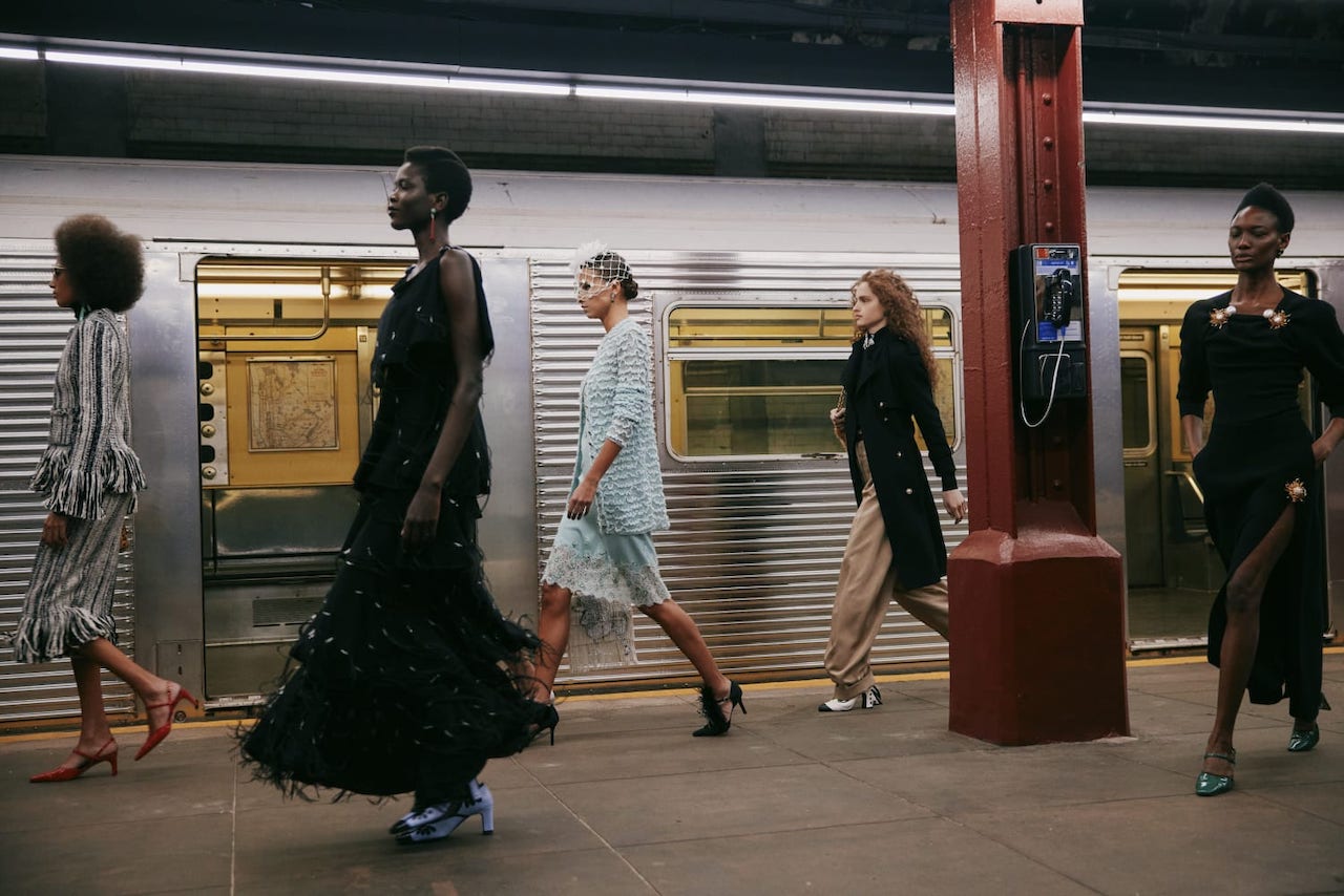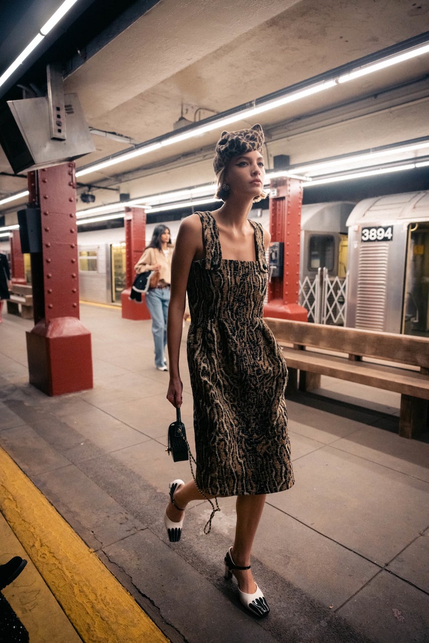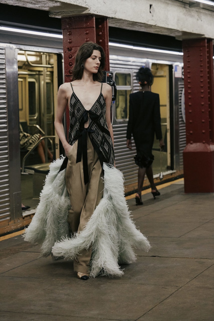 In a mix of the casual and fantastical that Chanel has been exploring in recent collections, the city served as the thematic focal point, interpreted through cinematic moments as a rush of models cascaded through the platform. Here, the subway is the great equalizer—a transference of energy as much as it is a means of moving bodies. In the words of Blazy, “It is a place full of enigmatic yet wonderful encounters, a clash of pop archetypes, where everyone has somewhere to go and each is unique in what they wear.”