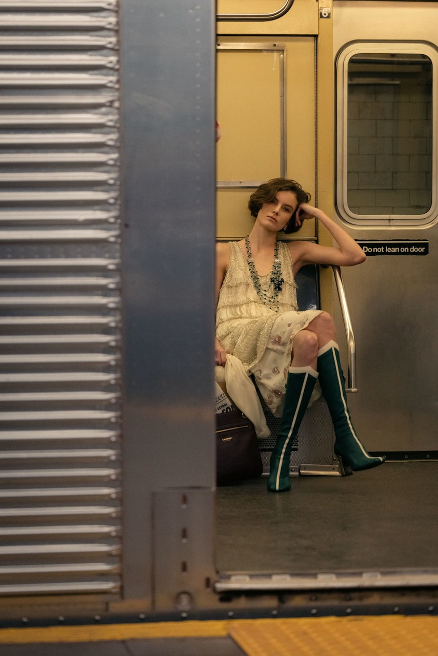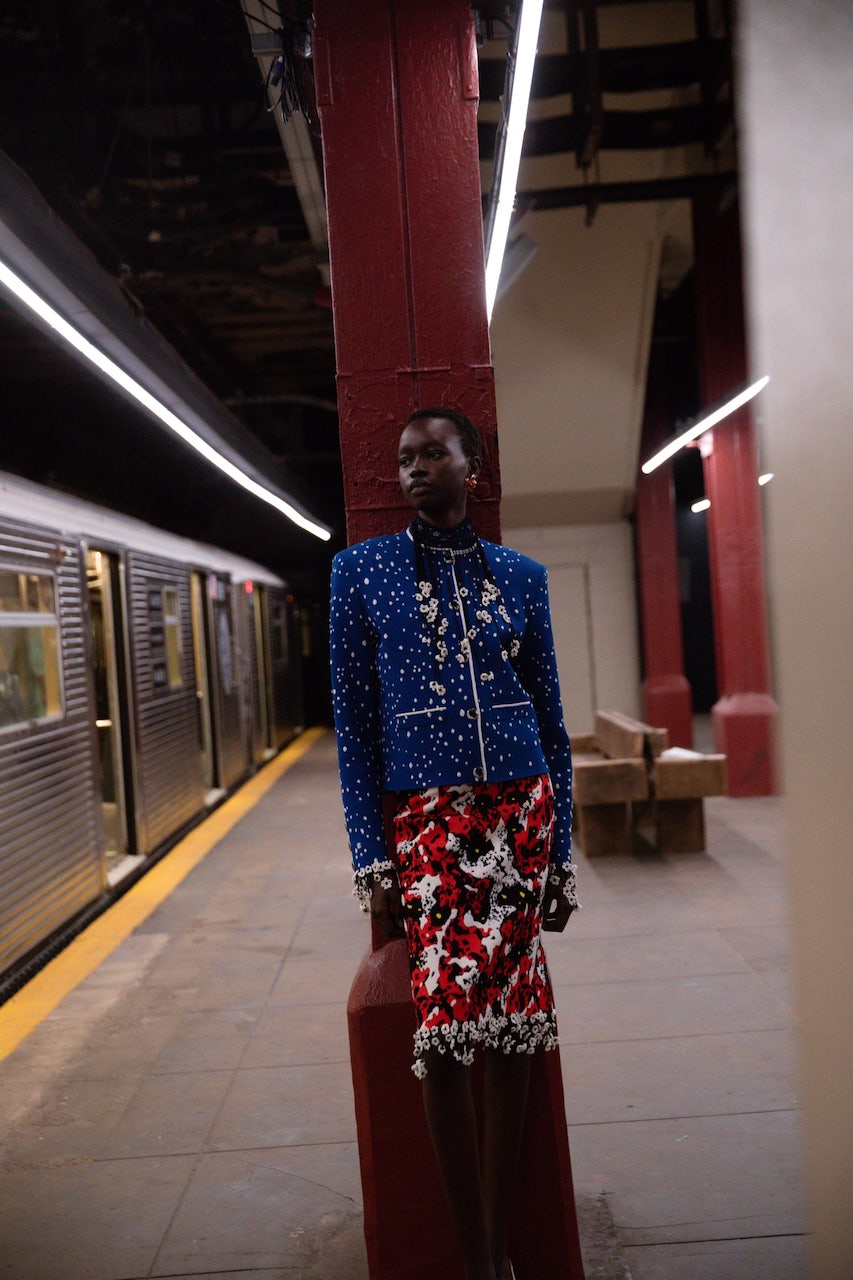 And in a moment where art imitated life, the ambassadors took their seats in the front row. As the train pulled in, a cast of characters stepped off, channeling the archetypes of a traveling city and draped in the evocative looks of the Métiers d’Art 2026 collection. Bold youth clad in expressive graphics, gallery girls in painterly gowns, business honchos in dramatic tailoring, and Upper East Side socialites in tweed suits who somehow made their way downtown.