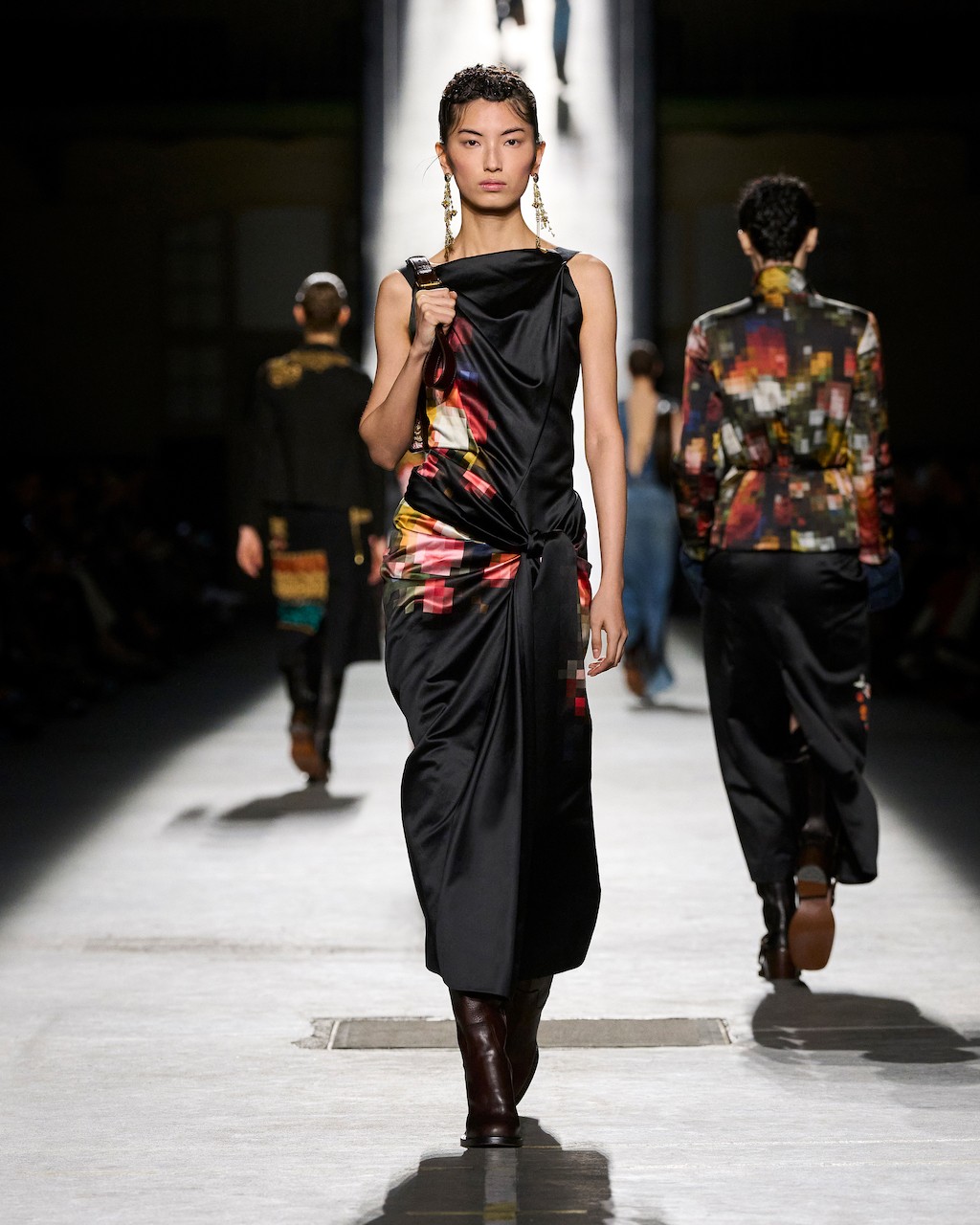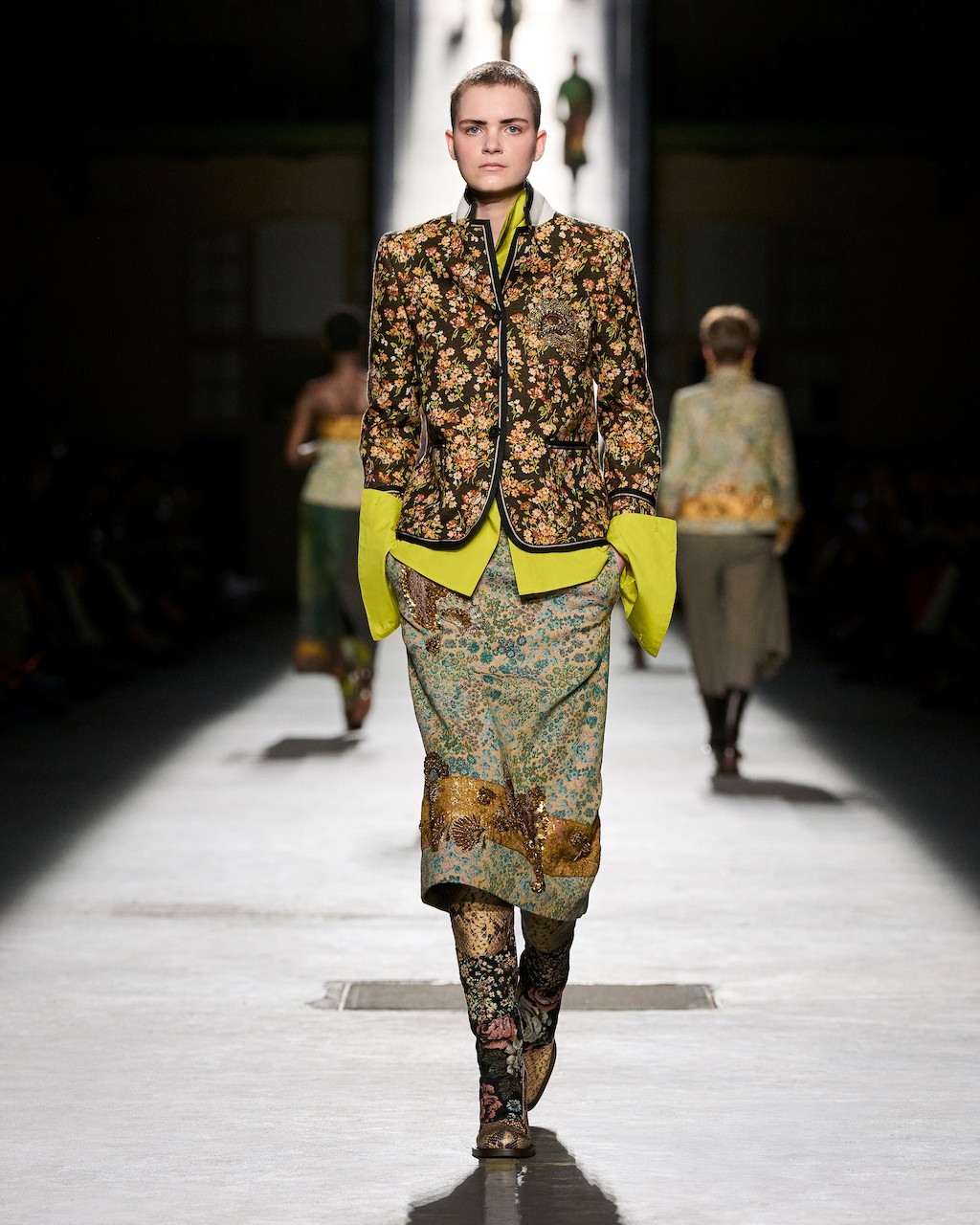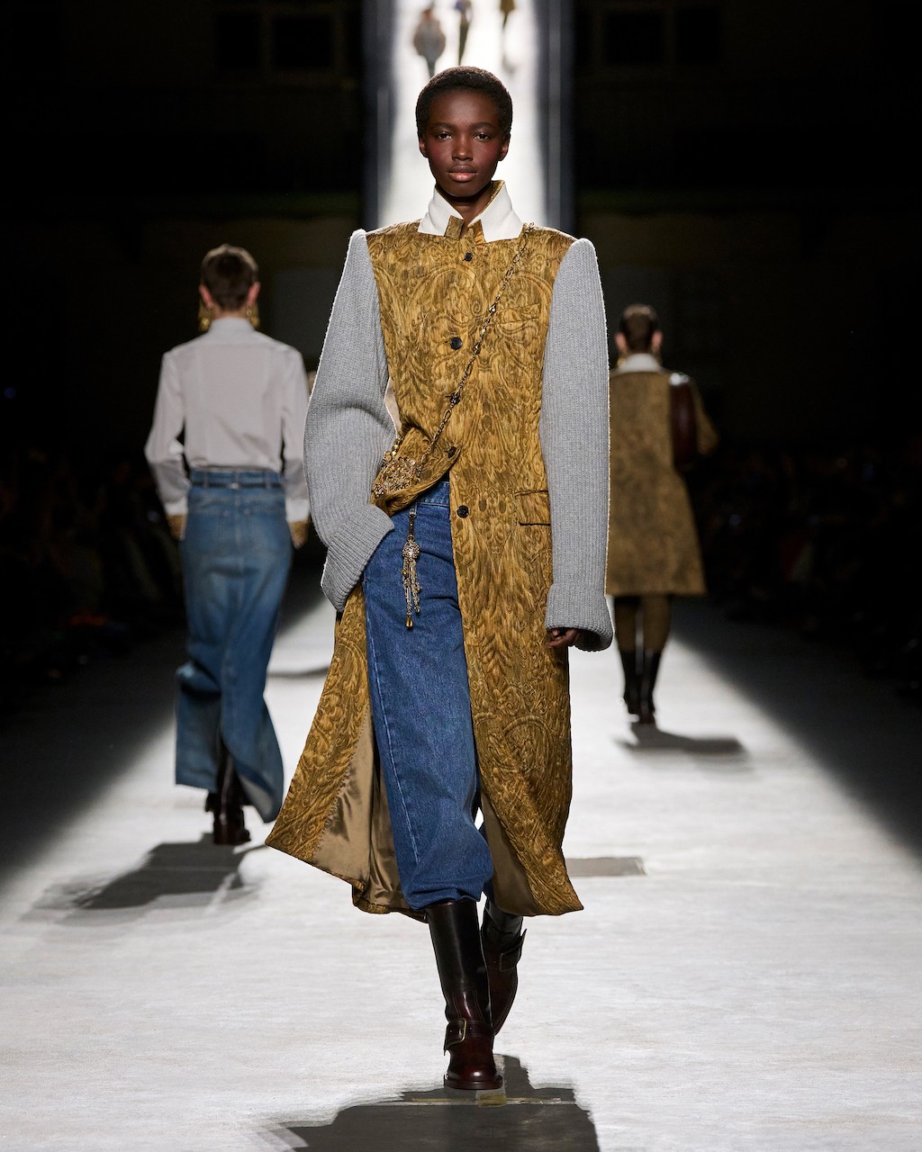 Garments collide unpredictably, and the house’s decades of fearless pattern play and cultural collage become subtly evident in how the sophistication of the fabrics is interrupted by bursts of youthful rebellion.