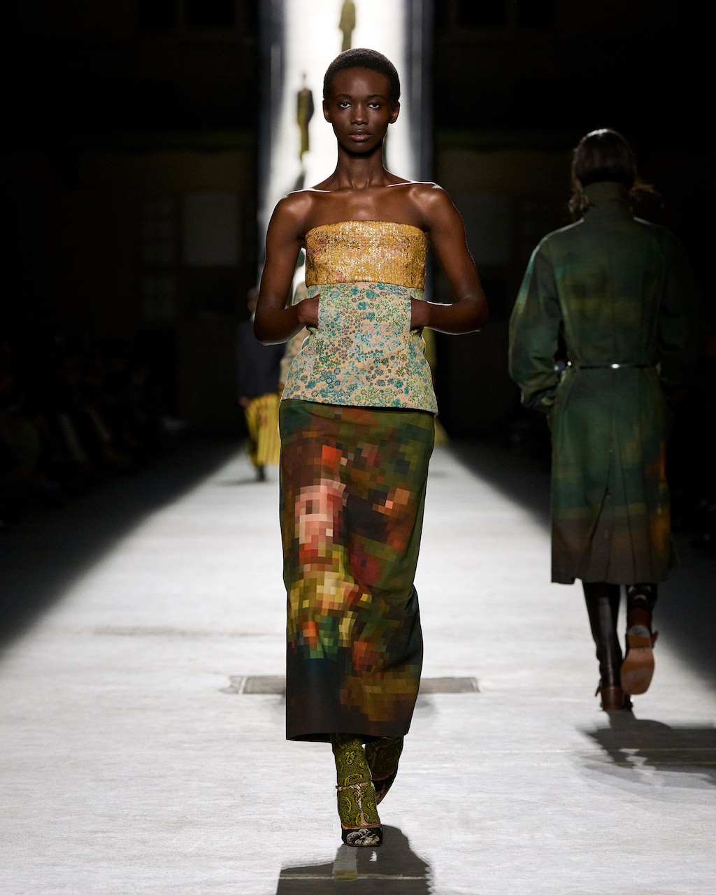 Classic shirts gained piped edges or gilded cuffs; blazers were fitted closely or draped loosely; pleated skirts collided with chunky knits and varsity-inspired pieces. Soon, bold floral collisions, pixelated patterns drawn from Flemish still lifes, and textured embellishments appeared.