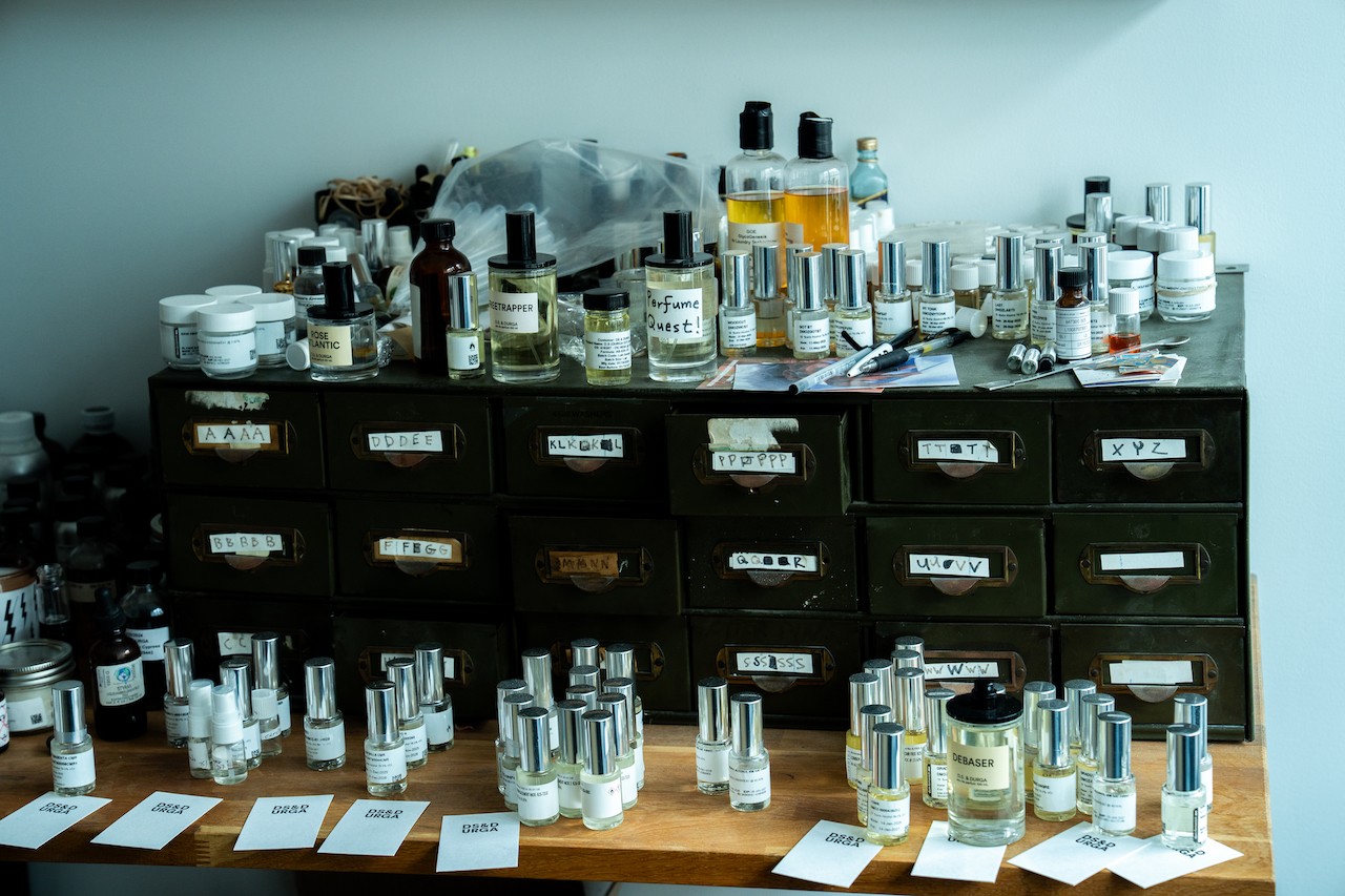 The studio itself becomes less a sanctuary than a working archive. Tables fill with scent strips, test bottles, packaging mockups, and half-finished experiments. Vinyl records line the shelves, and the pair often work in tandem, letting sound shape the atmosphere of the room.