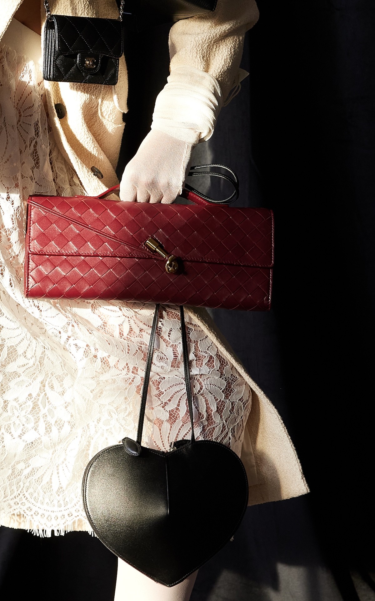 Jacket Jacquemus, Black Chain Bag Chanel, Red Bag Bottega Veneta, Heart Bag ALAÏA, Skirt & Gloves Stylist’s Archive