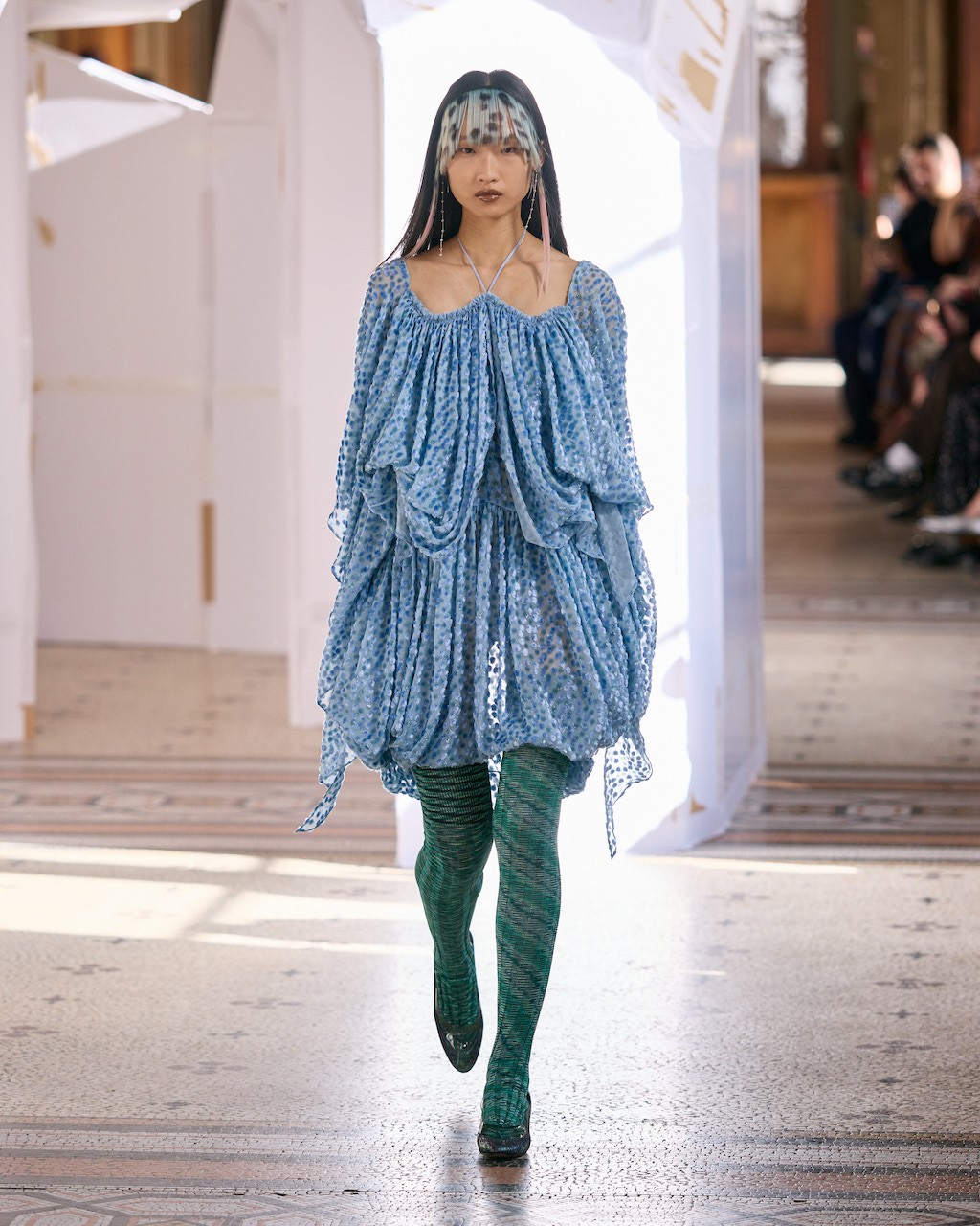 Everything meshed to bring to life the quiet majesty of birds in urban skies. In the Bulgarian designer’s vision, glancing out a window in Paris, Tokyo, or Los Angeles is not simply looking at concrete and sky—it is the art of noticing nature flashing green amid the gray. The wardrobe holds the tension between watcher and watched, framing it as the quiet question at the center of womanhood.