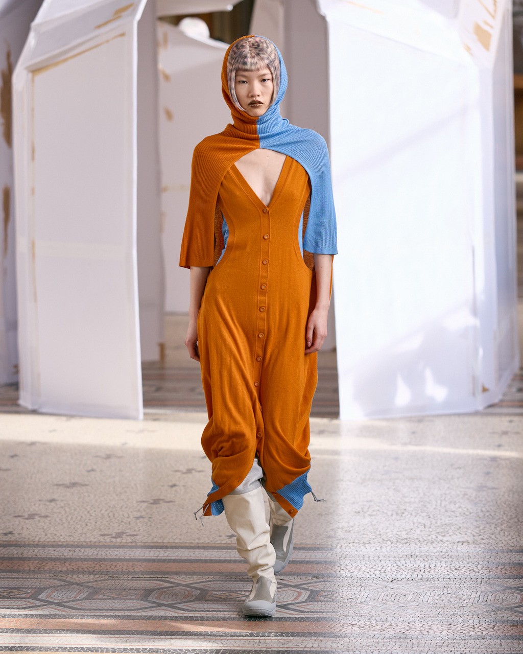 Often the pièce de résistance in a Kiko collection, the footwear did not go unnoticed. It was a défilé of perspex-trimmed pumps worn with glossy space-dyed socks and stretch leather boots. The renewed collaboration with ASICS revisited the tabi, combining a brogue-like front with the structure of a trail shoe at the back.