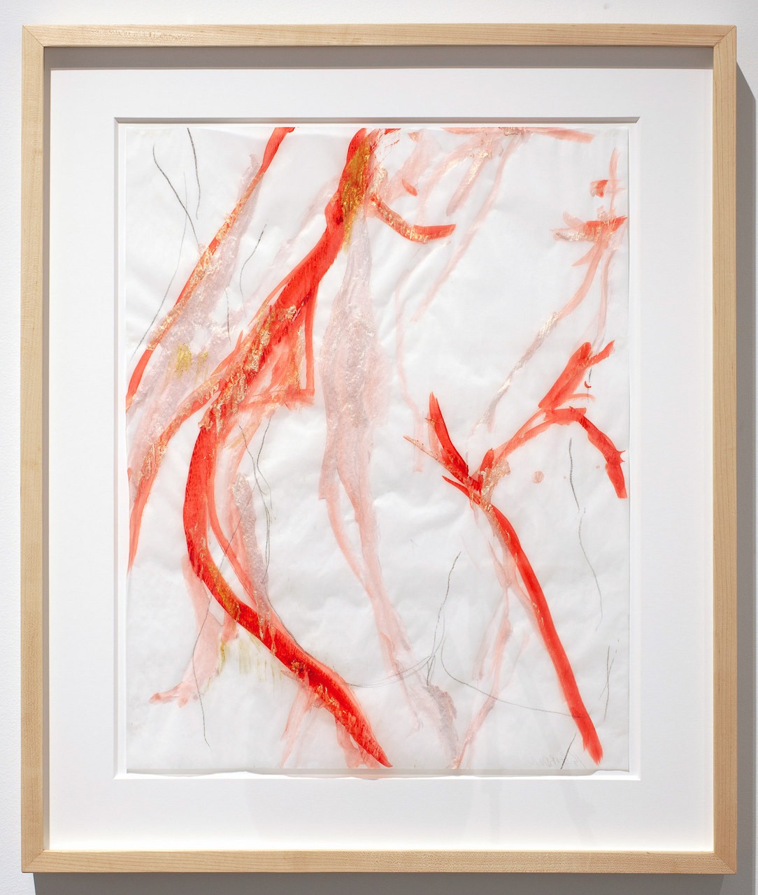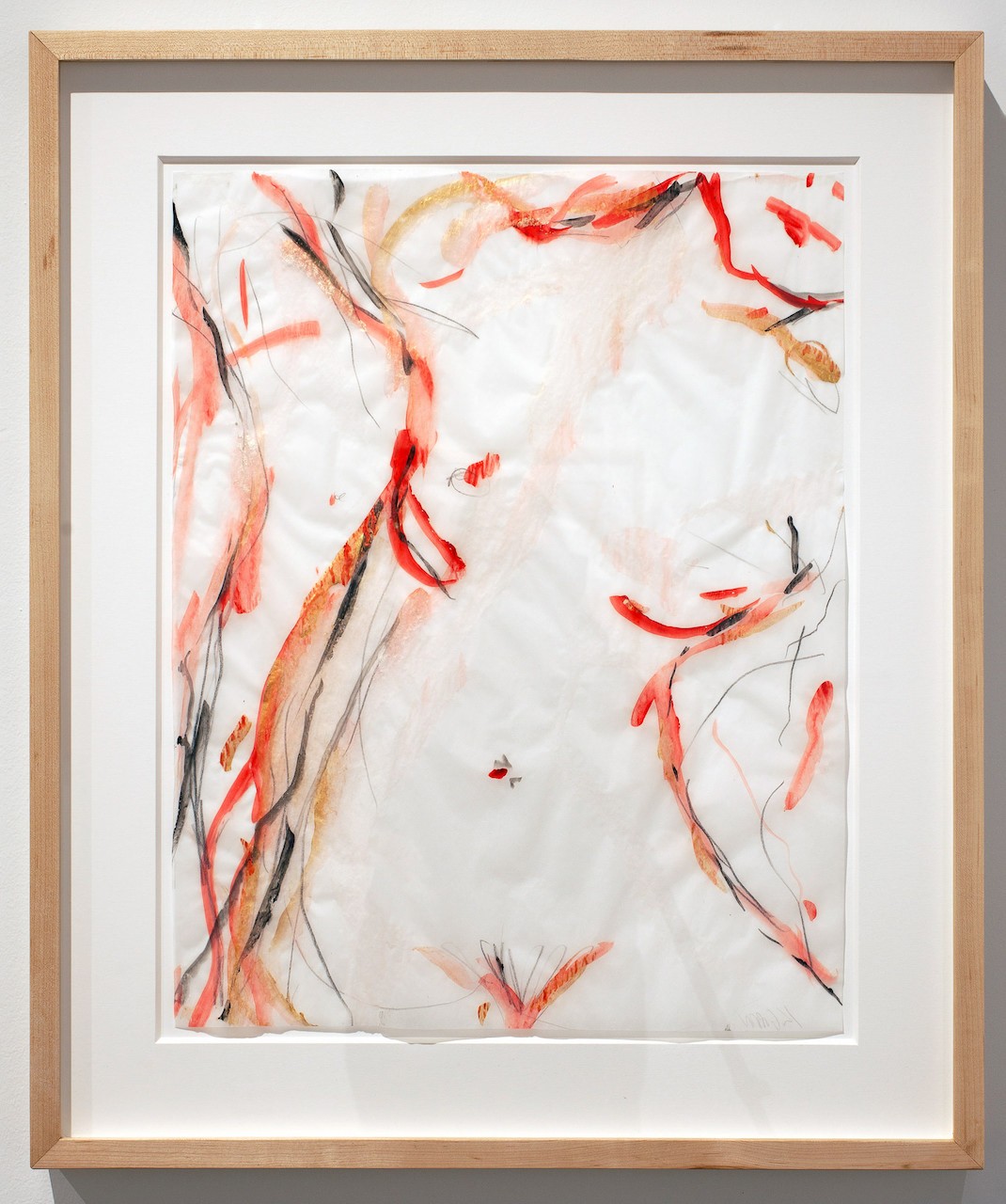 In Proposal for a painting (2022), the artist overlays digital scribbles onto an iPhone-captured photo of a white-sheeted hotel bed. The seemingly random lines take on meaning as markers of where the privacy of the hotel room collides with its impersonal nature. Airbnb Series (2019) feels relevant in a similar vein, tracing the fleeting presence of bodies within the temporarily occupied interiors. Here, sparse pencil sketches and soft brushstrokes in red, black, and gold lightly etch female nudes on tracing paper—their swift rendering suggesting movement and transience.