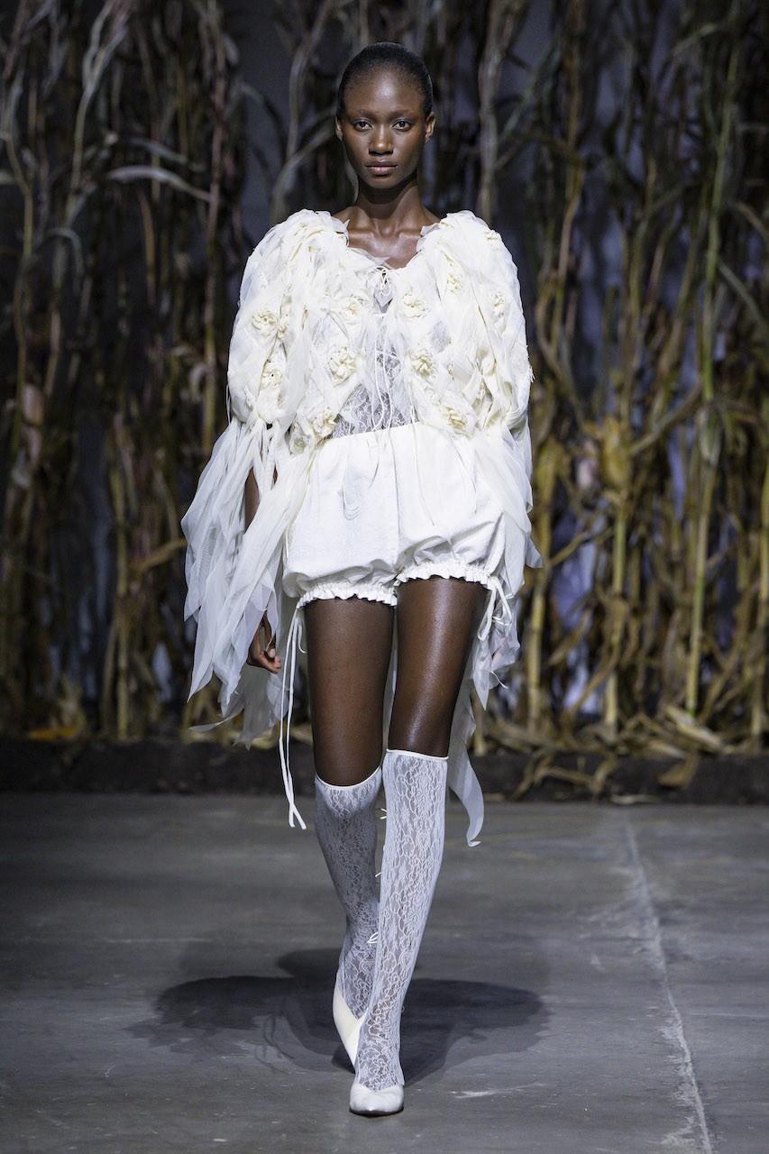 The Parisian designer’s presentation was a meditation on loss, resilience, and the fragile beauty of creation. Crochet flowers, knitted argyle, and airy tulle wove a narrative that mourned the loss of a close friend and reflected grief’s non-linear path of despair and joy. A gown in mourning black opened the show, while a swan-like white closed it, holding the tension between sorrow and hope. Inspired by Chekhov’s The Seagull, the collection holds that creativity can carry us through what feels unbearable. Perhaps the most evocative part was not the spectacle, but the honesty of the garments which emulate fragility and uncertainty.