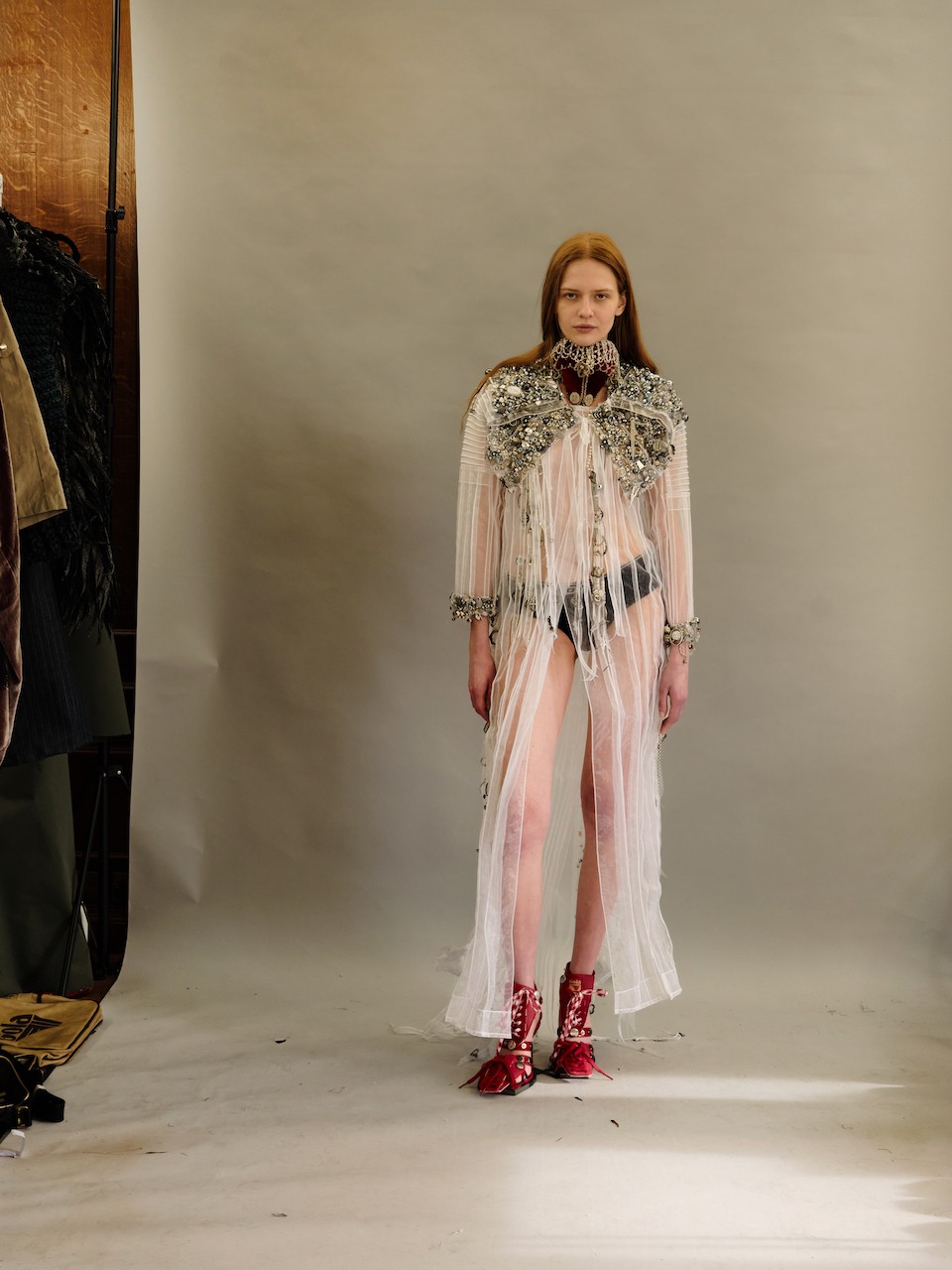 Just like the muse, various pieces of the collection embodied the act of rebuilding—deconstruction giving way to something newly formed. Customized Gola Classics were reworked into sporty heels, while other garments followed Raynor’s signature codes. “The Messenger Girl” look featured structured shoulder pads combined with Raynor’s love for tartan fabrics, while look two, ‘Brown Paper Packages Tied Up with String,’ had a crumpled effect and string-like finishes along each panel, tied into a bow at the back—lined, of course, with Raynor’s tartan peeking out from beneath.