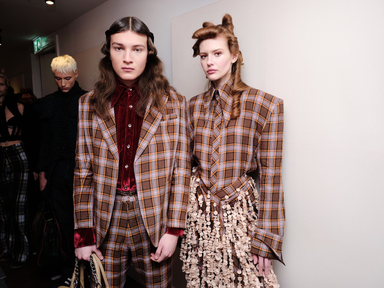 MAXIMILLIAN RAYNOR: To be quite frank, it’s all based on my recent heartbreak and the demise of a relationship that I thought would last forever and ended quite abruptly just before the show last season. It’s this idea of receiving that final farewell in the form of a love letter or a package. We introduce this “Post Girl” in a checkered look—a character imagined as “Royal Mail” meets a mid-century American messenger, tasked with delivering one final package. The two looks that follow represent the package itself, screwed up in despair.