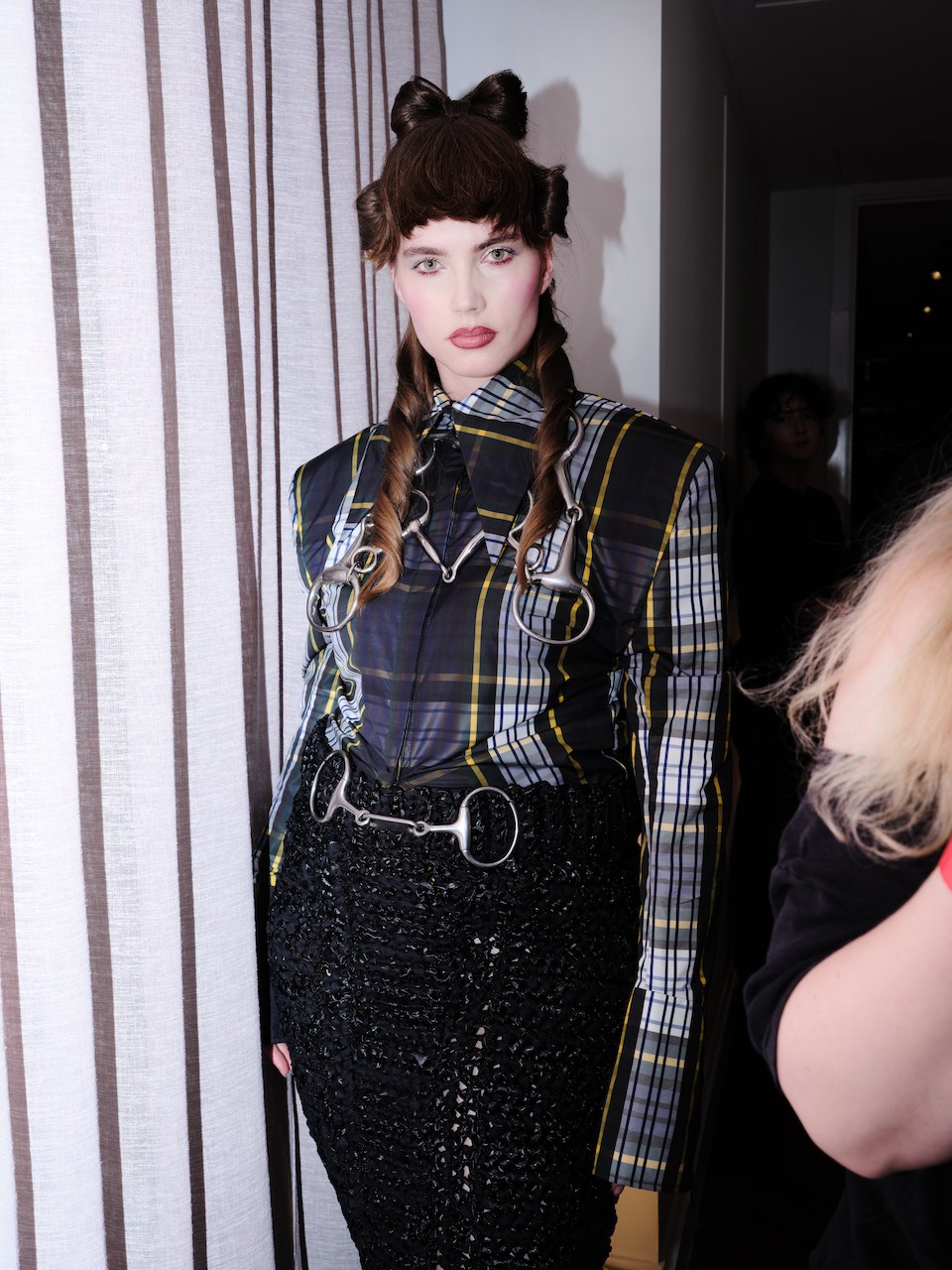 Just like the muse, various pieces of the collection embodied the act of rebuilding—deconstruction giving way to something newly formed. Customized Gola Classics were reworked into sporty heels, while other garments followed Raynor’s signature codes. “The Messenger Girl” look featured structured shoulder pads combined with Raynor’s love for tartan fabrics, while look two, ‘Brown Paper Packages Tied Up with String,’ had a crumpled effect and string-like finishes along each panel, tied into a bow at the back—lined, of course, with Raynor’s tartan peeking out from beneath.