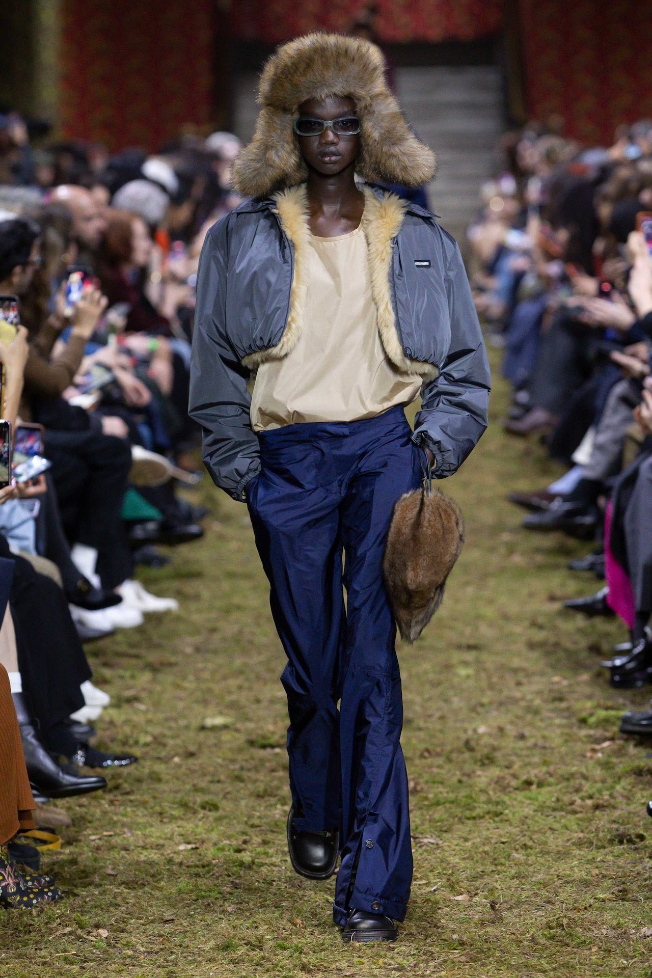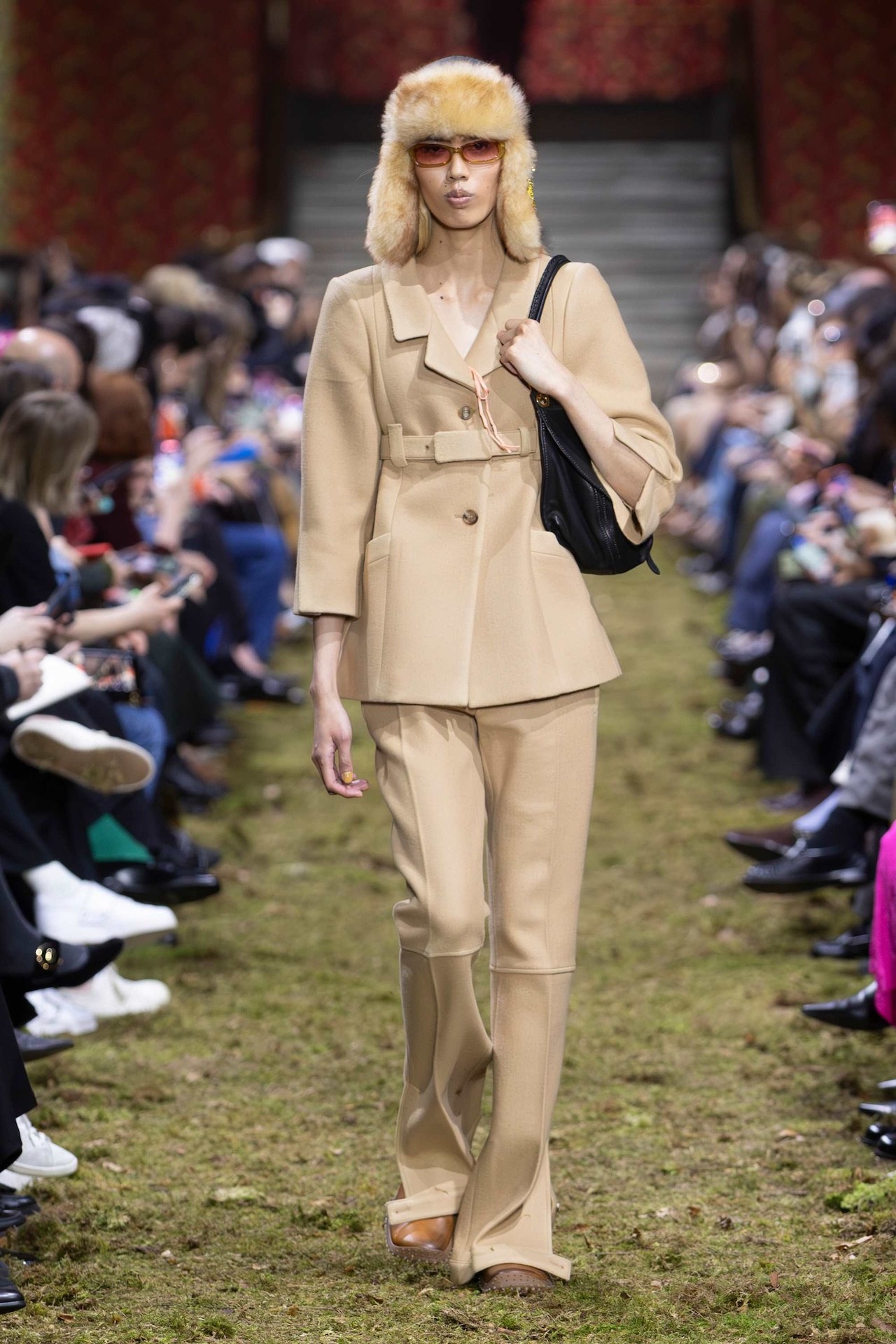 Silhouettes pulled close to the body, stripped of exaggeration. Slim coats cinched high at the waist were paired with flared pants that skimmed the mossy ground. Leather jackets made a gradual transition to shaggy fur at the hem, while sporty nylon-style puffers were lined with fluffy shearling.