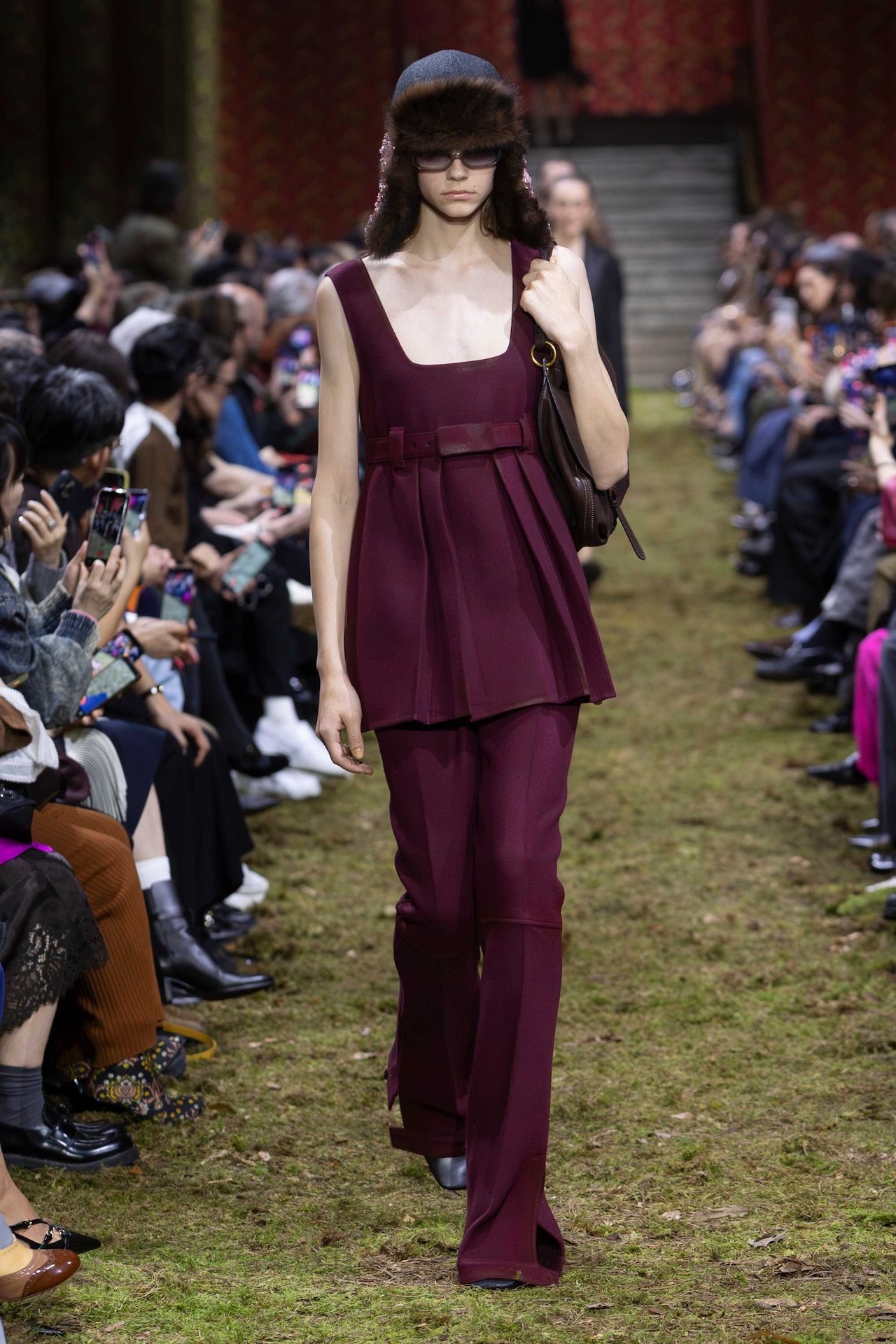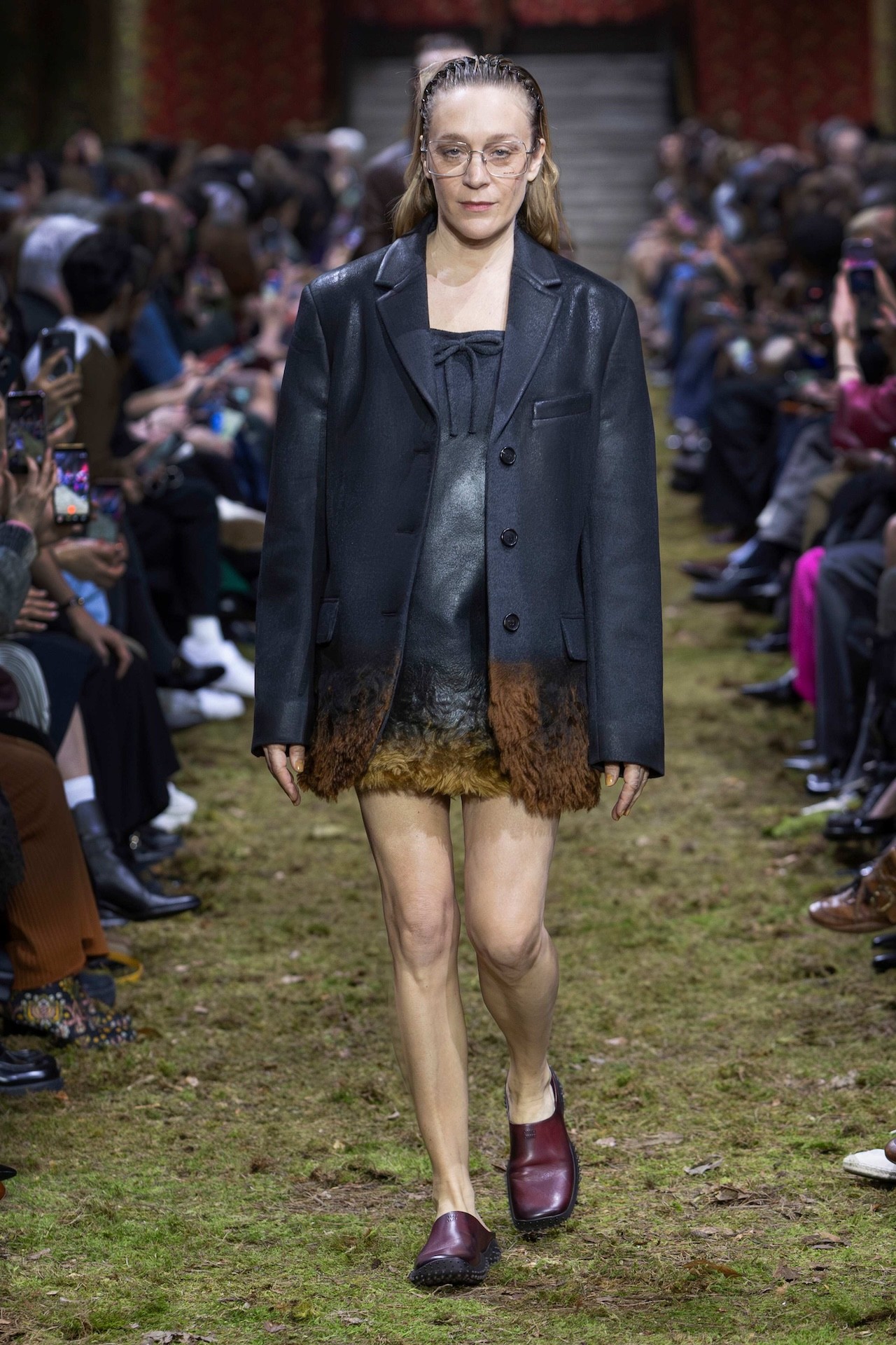 Unveiled during Paris Fashion Week inside the Palais d’léna, a real moss carpet and scattered twigs transformed the space into a wild forest. The earthy landscape became the setting for bodies to wander through. Against this grand natural scenography, the collection sent out a parade of toned-down looks that clung closely to the smallness of the human form. Actors Gillian Anderson, Chloë Sevigny, and Diana Silvers marched down the runway in tiny tank dresses, shrunken washed leather jackets, and bedazzled sneakers.