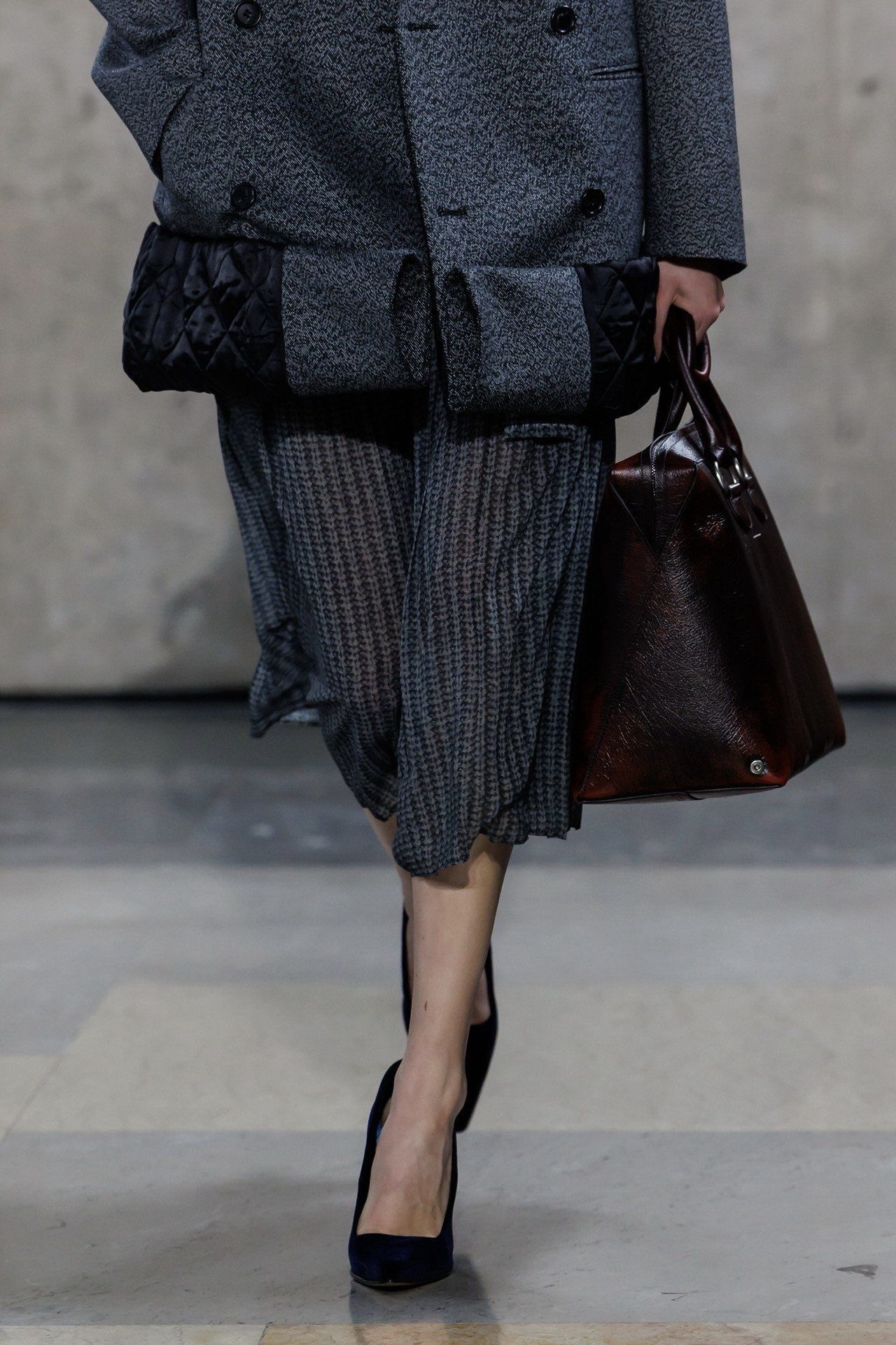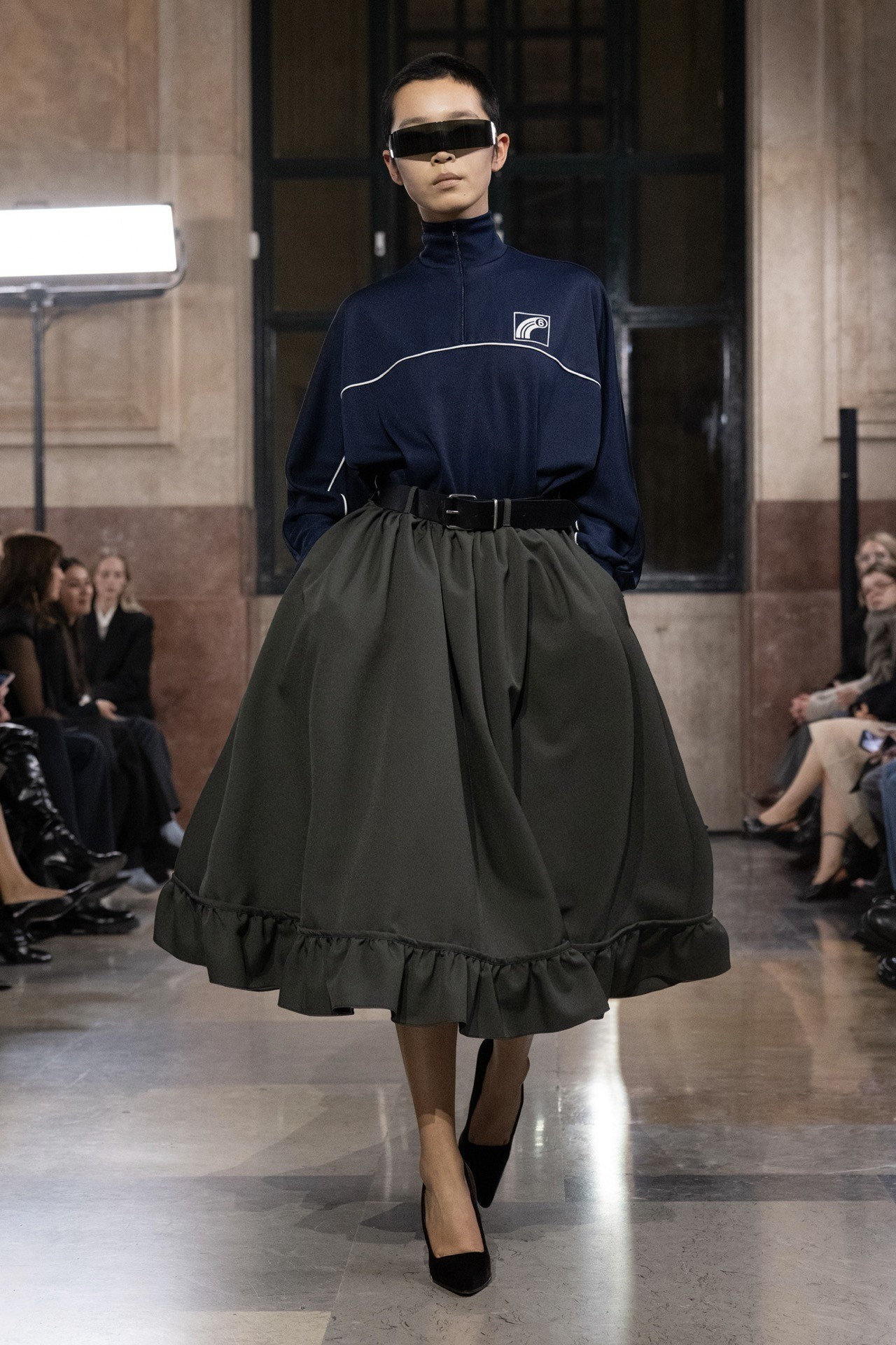 A mix of streamlined looks—anchored by sheer tights, black full skirts, and sharp blazers—leaned more toward corporate wear in its expression. Buckled at the waist and ruffled at the hem, the skirts swung in joyous motion as the models strode on, paired with flannel button-downs, navy A-line sports jerseys, or grey trench coats. Button-down shirts appeared deliberately disrupted, left half-unbuttoned, while V-necks kept the look clean-cut, styled with pencil skirts, culottes, and blue denims. With an oversized handbag in hand, the ensemble conjured a chic commuter sprinting through the busy station.