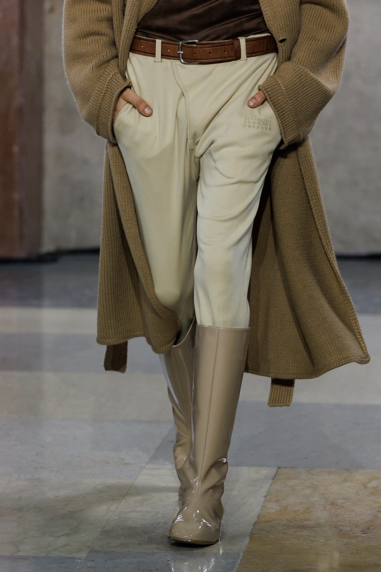 While the location usually bustles with commuters arriving and departing, tonight the backdrop lent itself to MM6’s fashion crowd. Sporting everyday clothes with a touch of chic V-necks, retro shell jackets, and gleaming knee-high boots, the label heightened normality by playing with hems, prints, and layering.