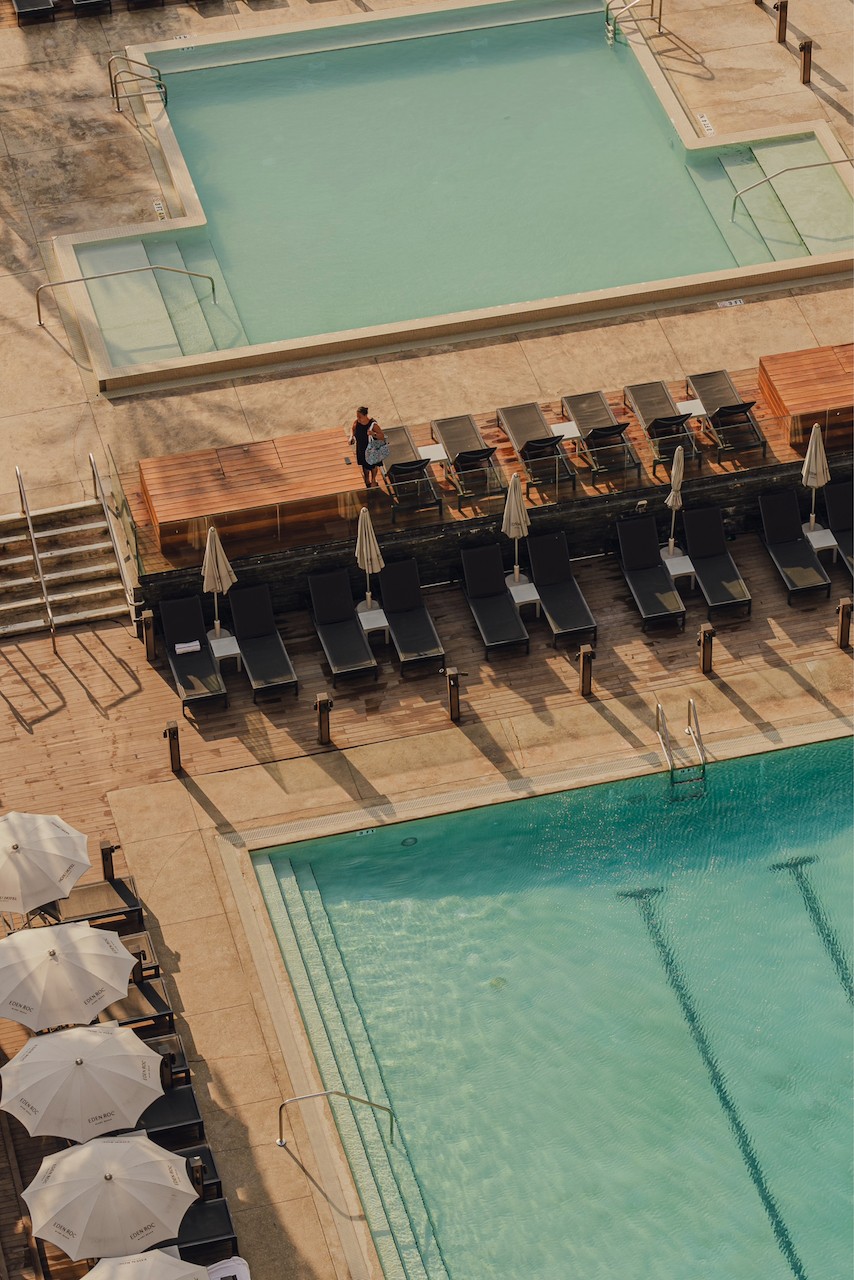 Downstairs, the rhythm of the day moved easily between the hotel’s two pools, which stretch toward the beachfront in a way that feels almost continuous. The transition from pool to ocean is seamless, as if the property is guiding you outward. One afternoon, I settled into a chair facing the water with a book and lost time, moving only occasionally between the pools and the sand. The beachfront itself feels expansive and slightly removed from the busier stretches of Miami, with that same dreamlike quality lingering in the air.