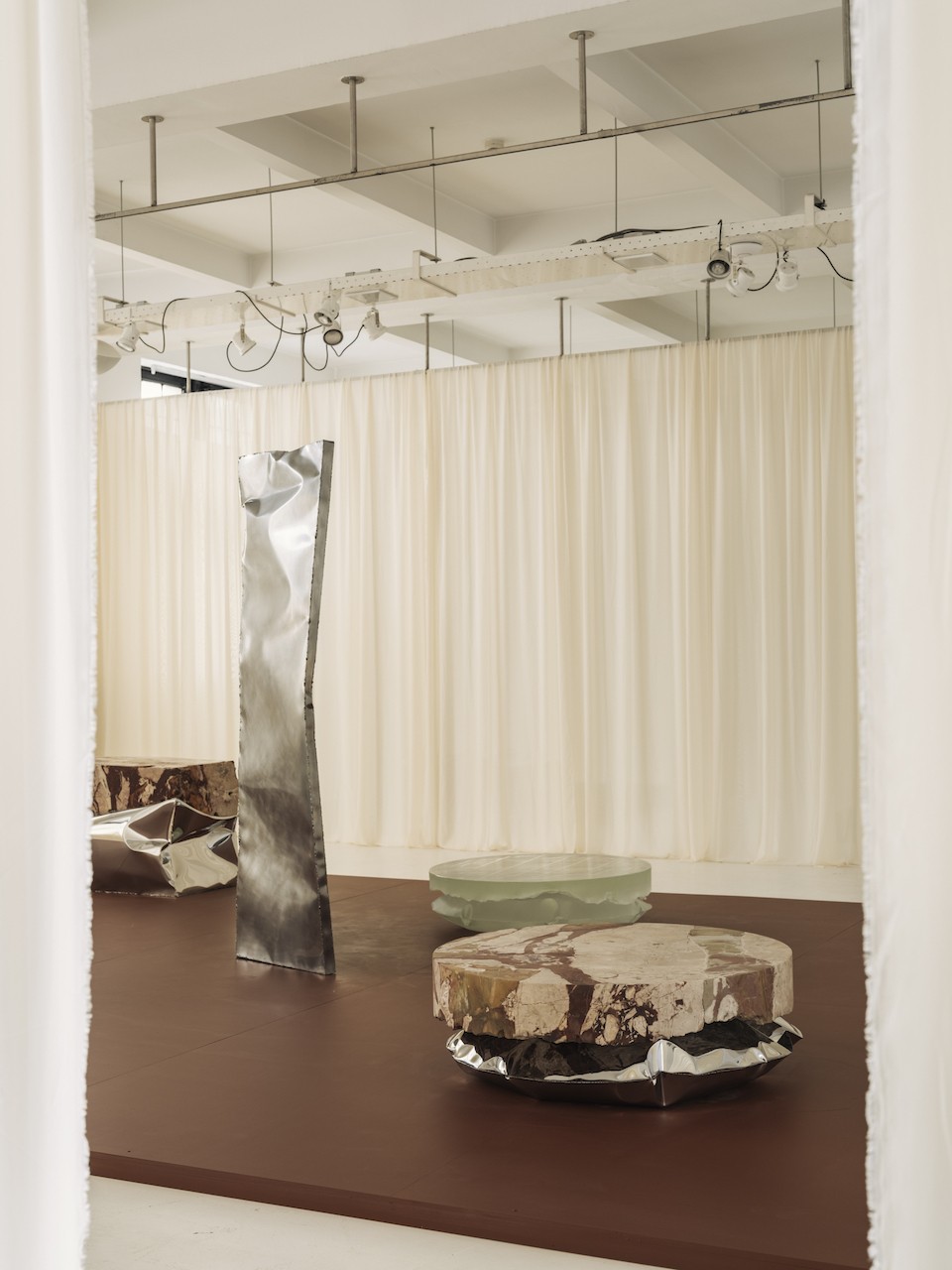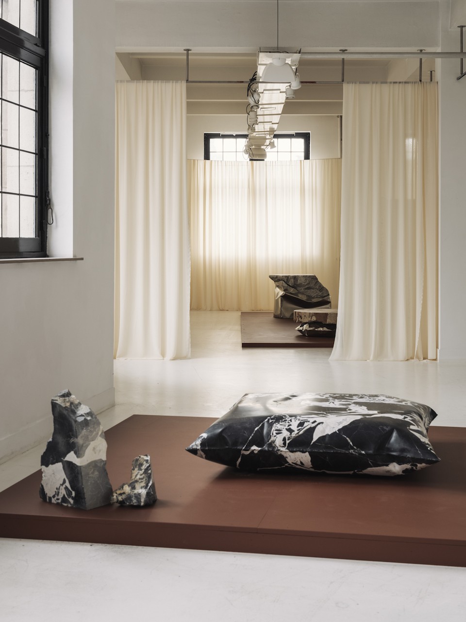 Materials like stone, marble, resin, and leather are elevated through skill and intention. The work of Ben Storms, displayed on the second floor and framed by long off-white curtains, reflects the weight of his stonemason heritage—a deep connection to craft and history. His pieces evoke an extraordinary heaviness through stone while creating an illusion of lightness that seems to defy gravity.