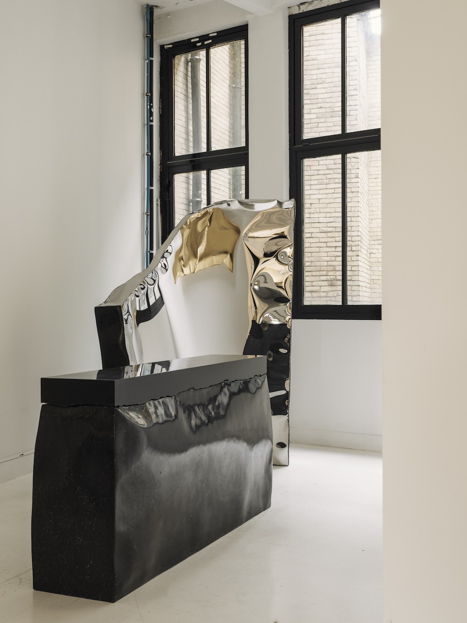 Ascending to the second floor via an elegant staircase with an old elevator at its center (a distinctly Parisian touch), the works of KRJST Studio and Lionel Jadot are displayed choreographically. Pieces are arranged to interact with one another, and a narrative emerges through their interplay. A long, glossy black table sits near a metallic sculpture, each material and form highlighting the other. “The narrative is not only about the technique. It’s about the relationship each artist has with their material,” the gallery assistant notes.