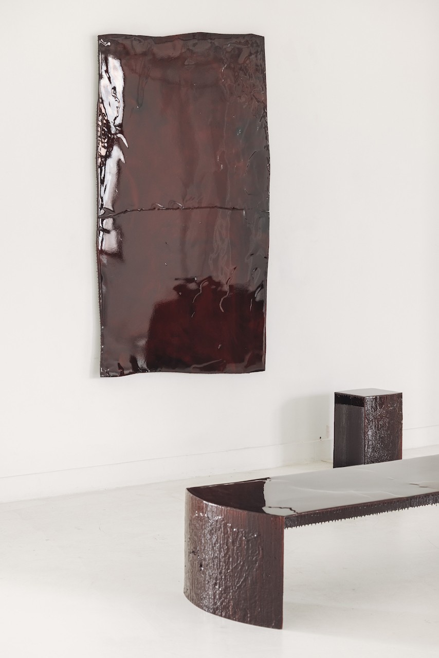 The furniture throughout is ergonomic and entirely original. It defies the conventions of ready-to-assemble design, existing instead as small series, limited editions, or fully custom commissions. Even familiar materials become extraordinary through careful craftsmanship, such as the long black table by Terra Atlas (Middernacht & Alexander), whose dripping dark tones feel simultaneously grotesque, erotic, and functional.