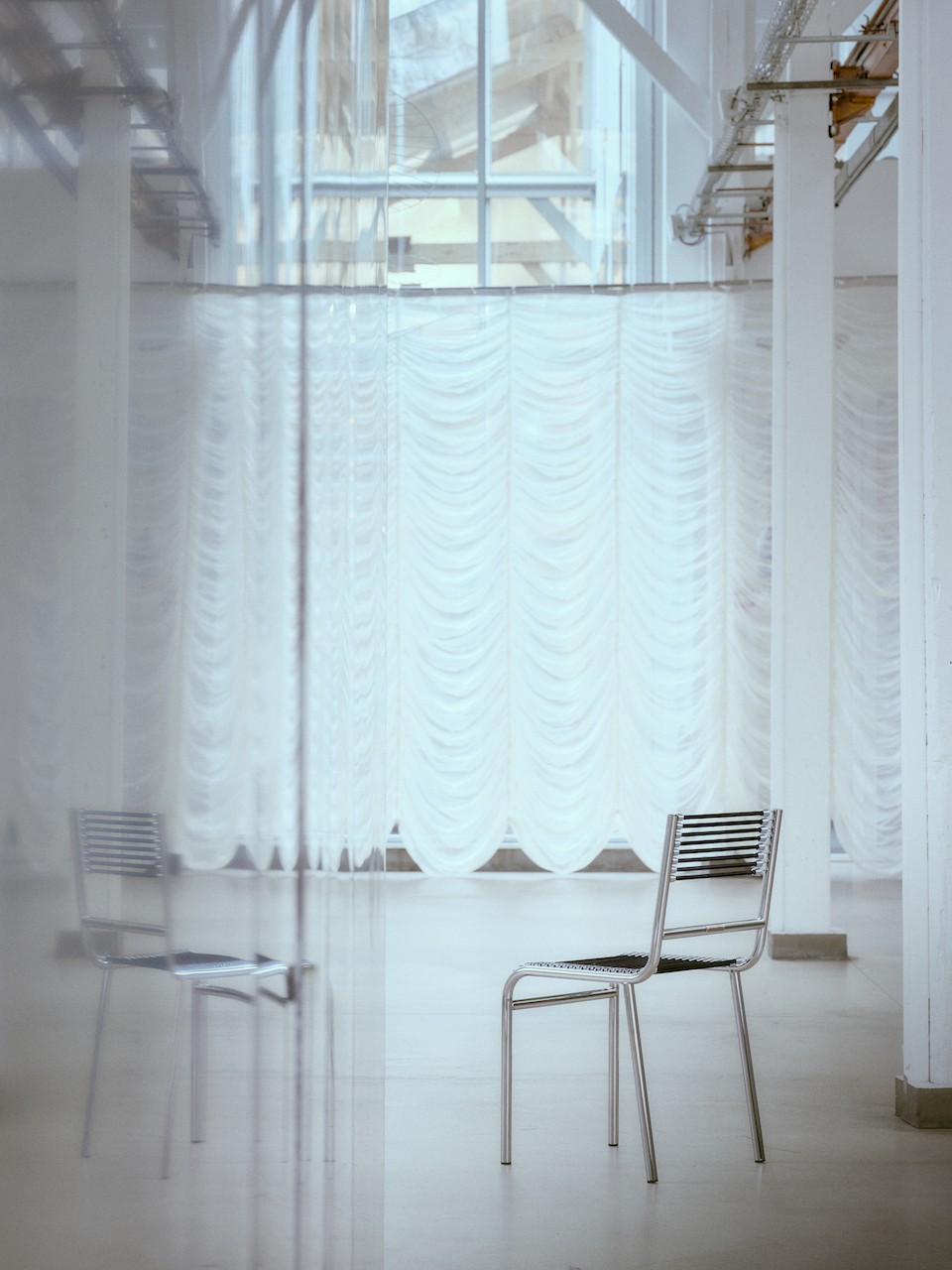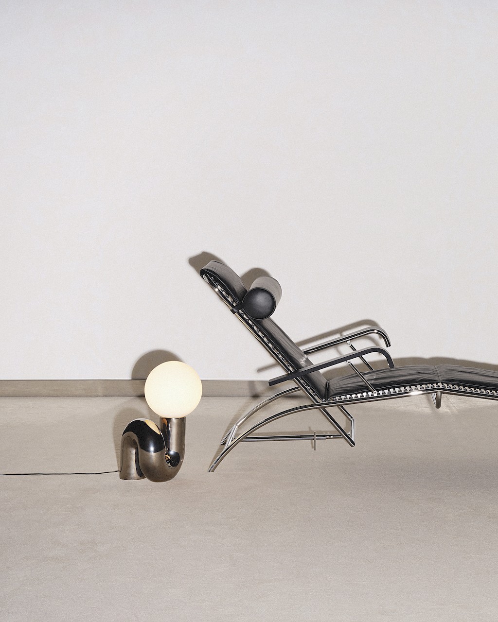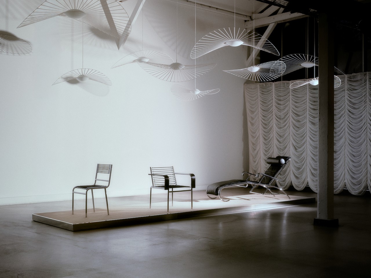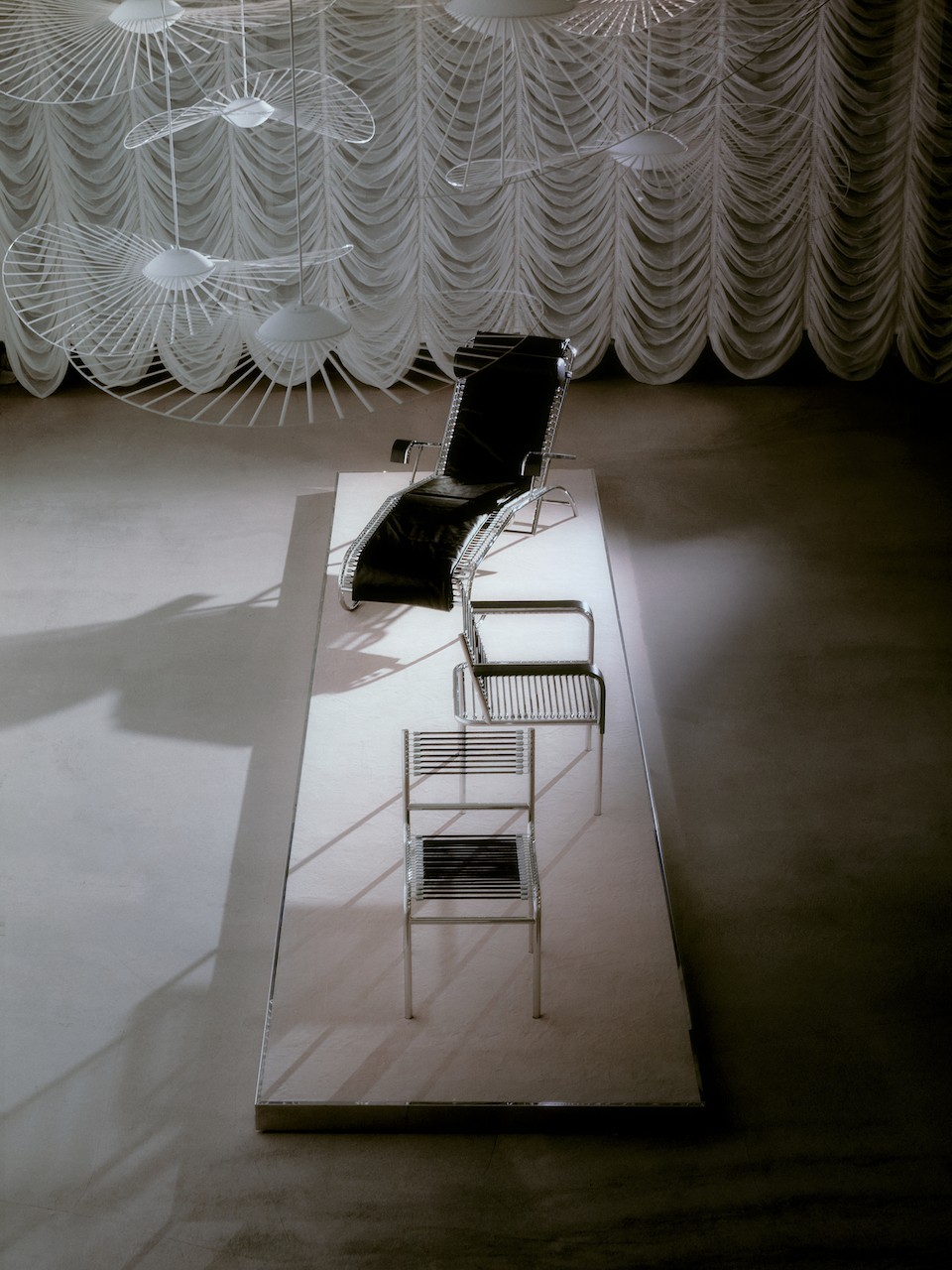 Just beneath these decorative fixtures, three chair pieces from French designer and architect René Herbst’s Sandows Collection rested quietly in the space, soaking up the spotlight. The display marked Petite Friture’s first-ever reissue of the collection, featuring the Chair N° 212, the Armchair, and the Daybed N° 114 from the 1927 Sandows series.